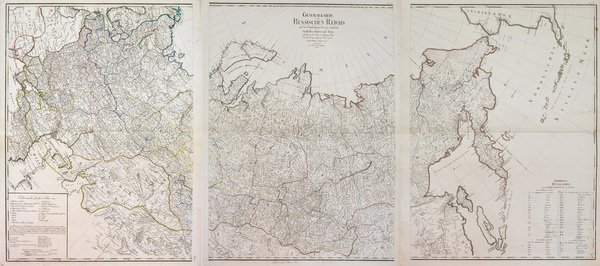 Incisione in rame in lieve coloritura d'epoca ai confini pubblicata in 3 fogli da unire per complessivi mm. 800x1750, tratta "Allgemeiner deutscher Atlas aller Länder", Vienna 1786-94; la carta è basata, come citato nel titolo, sulla grande carta dell'impero russo pubblicata a San Pietroburgo nel 1787 e sui viaggi di Lesseps. Perfettamente conservata, ampi margini.