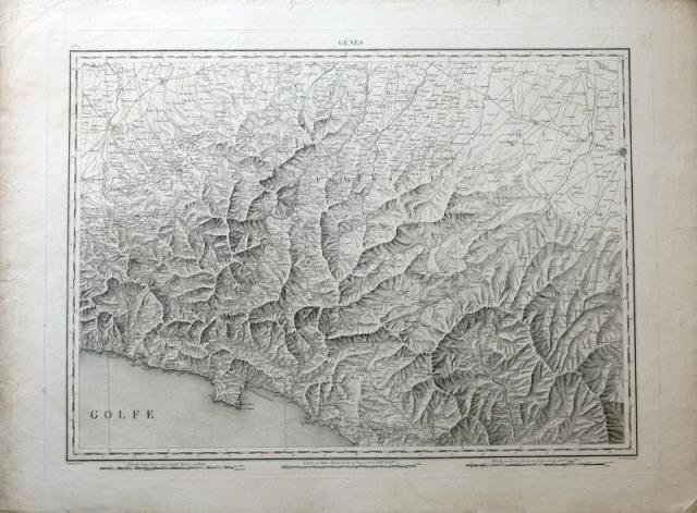 Francia, 1830 circa. Incisione in rame all'acquaforte, b/n, cm 50,5 x 68,5 (alla lastra) più margini; in basso a sn. “Raymond direxit”, in basso a ds. “F. P. Michel Sculp.”. Carta con l parte di Golfo che si estende da Voltri a Deva e Camogli, fino a comprendere, verso l’interno, parte del Ducato di Piacenza e del Ducato di Parma, con ben segnalati tutti i lori dintorni e località anche minori, e quindi comprendente un ampissimo raggio di territorio. Un po' di ingiallimento all'estremo margine laterale sinistro, buono stato.
