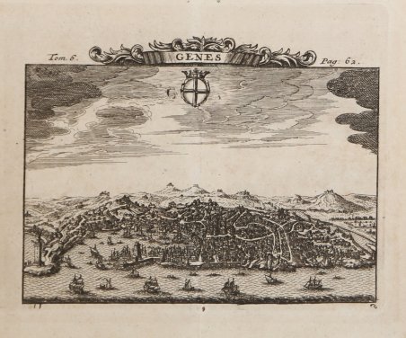 Veduta tratta dal "Les delices de l'Italie, contenant une description exacte du Païs, des principales villes, de toutesa les Antiquitez" edito, per la prima volta, a Leida nel 1706 da Pieter Vander Aa e successivamente ristampato a Parigi da Guillaume Cavelier.La maggior parte delle copie della seconda edizione reca nel frontespizio l'indicazione Compagnie des libraires, associazione di librai stampatori la cui composizione è variata negli anni ma di cui Guillaume Cavelier faceva parte. La guida, che sappiamo da Barbier I, 872 essere opera di Rogissart e dell'abate Havard, è impreziosita da 152 tavole,Incisione in rame, due piccoli fori di tarlo in alto, per il resto in buono stato di conservazione. View taken from "Les delices de l'Italie, contenant une description exacte du Païs, des principales villes, de toutesa les Antiquitez" first published in Leiden in 1706 by Pieter Vander Aa and later reprinted in Paris by Guillaume Cavelier. Most copies of the second edition bear on the title page the indication Compagnie des libraires, an association of booksellers-printers whose membership has varied over the years but to which Guillaume Cavelier belonged. The guide, which we know from Barbier I, 872 to be the work of Rogissart and Abbot Havard, is embellished with 152 plates, Copperplate engraving, in good condition. Cfr.