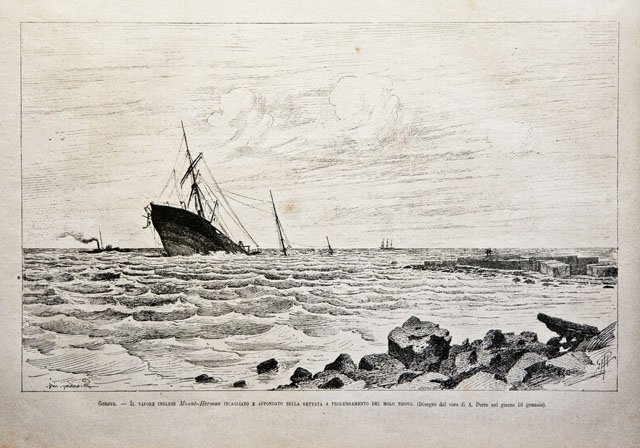 Genova / Il vapore inglese Mount-Herman incagliato e affondato sulla gettata a prolungamento del molo nuovo