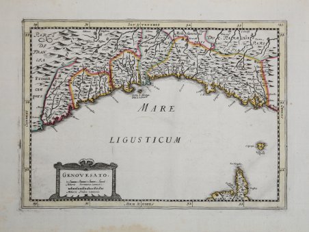 Carta geografica della Liguria preparata da Jodocud Hondius Jr. per il ' Nova et accurata Italiae hodiernae descriptio in qua omnium eius regionum, vrbium, pagorum, dominiorum, castellorum, montium, fluviorum, fontium, lacuum, et portuum, historia exhibetur. ' Geographicis tabulis et vrbium praecipuarum iconibus illustrata a Iudoco Hondio addita est Siciliae, Sardiniae, Corsicae, et itinerariorum per Italiam brevis delineatio, stampato a Leida dalla tipografia Elzevir nel 1627. Si tratta di un atlante geografico unito ad una raccolta di cartografia urbana, esclusivamente dedicato alla penisola. ' ' L’opera consta di 31 carte geografiche e 67 vedute o piante di città. Le carte derivano dall’Atlas Minor ' del Mercator, mentre la cartografia urbana è basata sui modelli introdotti a Venezia da Francesco Valegio e da quelli del ' Civitates Orbis Terrarum ' di G.Braun e F. Hogenberg. L’opera è relativa al periodo in cui Jodocus Hondius II si era appena diviso dal fratello Hendrick. Secondo la letteratura esisterebbe una prima edizione della raccolta, stampata ad Amsterdam nel 1626. Questo esemplare, privo del testo al verso, è una successiva ristampa del 1734 curata dall’editore Henri du Sauzet ed inserita nel ' Atlas portatif composé de CCLXXXV cartes, de plusieurs habiles geographes; où sont representées toutes les parties de la terre. Amsterdam, Henri Du Sauzet, 1734. (Koeman II, p. 546 Me 207). Si tratta di una raccolta di 285 carte geografiche di diversi autori, del quale aveva acquistato le matrici. Jodocus Hondius Jr. nacque nel 1593, e la sua prima pubblicazione firmata fu una mappa della Scandinavia, pubblicata nel 1613. Figlio di Jodocus Hondius (1563-1612) - incisore, cartografo, stampatore ed editore – che fu il fondatore della tipografia Hondius, una delle più importanti dell'epoca. Con la morte - nel 1612 - ' ' di Jodocus senior, la vedova Coletta van den Keere continuò l'attività con i suoi due figli; Jodocus Jr. e Hendrick (1597-1651) ne presero il posto. Nel giugno 1621, Jodocus Jr. sposò Anne Staffmaecker, e si trasferì in un negozio sulla Diga, dove stabilì la propria attività editoriale. Secondo Peter van the Krogt (cfr. ' Atlantes Neerlandici) Jodocus Hondius Jr. e suo fratello minore Hendrick, erano concorrenti. Henri du Sauzet (1687 circa -1754) fu libraio ed editore di mappe e atlanti. – Nativo di Tolosa, Ugonotto o "gesuita apostata" secondo Voltaire, arrivò ad Amsterdam intorno al 1713. Nel 1715 fu ammesso alla corporazione dei librai dell'Aia per ordine dei borgomastri, nonostante la mancanza di qualifiche. Tornò ad Amsterdam, dove divenne borghese e membro della corporazione dei librai nel giugno 1718. Editore e direttore di diversi periodici, in particolare delle "Nouvelles littéraires" dal gennaio 1715 al giugno 1720, delle "Mémoires de littérature" dal 1715 al 1717, de "La Bagatelle ou Discours ironiques" dal maggio 1718 all'aprile 1719 e della "Bibliothèque françoise ou Histoire littéraire de la France", che continuò dal 1730 al 1746. Nel novembre 1747 vendette i suoi beni mobili ai creditori. È noto un inventario della sua attività redatto dopo la morte, il 22 giugno 1754; la vendita dei suoi beni avvenne nel settembre dello stesso anno. Incisione in rame, bella coloritura coeva dei contorni. ' Molto rara. Map of Liguria prepared by Jodocud Hondius Jr. for the ' from Nova et accurata Italiae hodiernae descriptio in qua omnium eius regionum, vrbium, pagorum, dominiorum, castellorum, montium, fluviorum, fontium, lacuum, et portuum, historia exhibetur. Geographicis tabulis et vrbium praecipuarum iconibus illustrata a Iudoco Hondio addita est Siciliae, Sardiniae, Corsicae, et itinerariorum per Italiam brevis delineatio, printed in Leiden by the printing house Elzevir in 1627. This is a geographical atlas combined with a town book, exclusively dedicated to Italy. ' ' The work consists of 31 maps and 67 views or plans of cities. The maps derive from Mercator's ' Atlas Minor, ' while the plans are based on the models introduced in Venice by Francesco Valegio and those of ' Civitates Orbis Terrarum ' by G. Braun and F. Hogenberg. The work is related to the period in which Jodocus Hondius II had just separated from his brother Hendrick. According to the literature there is a first edition of the collection, printed in Amsterdam in 1626. This example, lacking the text on the verso, is a later 1734 reprint edited by publisher Henri du Sauzet and included in ' Atlas portatif composé de CCLXXXV cartes, de plusieurs habiles geographes; où sont representées toutes les parties de la terre. Amsterdam, Henri Du Sauzet, 1734. (Koeman II, p. 546 Me 207). This is a collection of 285 maps by different authors, whose plates he had acquired. Jodocus Hondius Jr. was born in 1593, and his first signed publication was a map of Scandinavia, published in 1613. He was the son of Jodocus Hondius (1563-1612) - engraver, cartographer, printer and publisher - who was the founder of the Hondius printing house, one of the most important of the time. With the death - in 1612 - of Jodocus senior, his widow Coletta van den Keere continued the business with her two sons; Jodocus Jr. and Hendrick (1597-1651) took his place. In June 1621, Jodocus Jr. married Anne Staffmaecker and moved to a shop on the Dyke, where he established his publishing business. According to Peter van the Krogt (see ' Atlantes Neerlandici) Jodocus Hondius Jr. and his younger brother Hendrick were competitors. Henri du Sauzet (c. 1687-1754) was a bookseller and publisher of maps and atlases. - A native of Toulouse, a Huguenot or "apostate Jesuit" according to Voltaire, he arrived in Amsterdam around 1713. In 1715 he was admitted to the booksellers' guild in The Hague by order of the burgomasters, despite his lack of qualifications. He returned to Amsterdam, where he became a burgomaster and a member of the booksellers' guild in June 1718. Editor and director of several periodicals, notably
