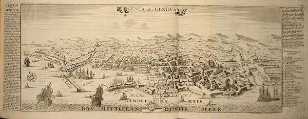 Incisione originale su rame (cm. 46x16,5 più margini bianchi) tratta da ‘Curioses Staats und Kriegs Theatrum.’. Esemplare in perfetto stato di conservazione. Rara ed affascinante veduta a volo d’uccello della città di Genova.