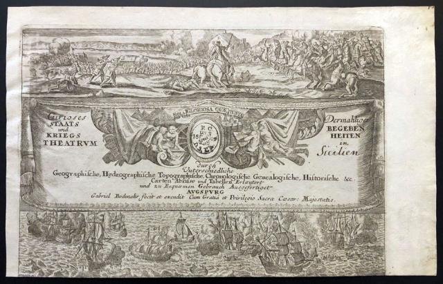 Gabriel Bodenehr fecit et excudit, Augsburg, 1760 circa. Incisione in rame all’acquaforte, cm 18 x 28,5 circa. Frontespizio dell’opera, decorativo per le due battaglie di terra e di mare che vi compaiono. Foglio rifilato al margine inferiore ma ben inciso e in buono stato di conservazione. .