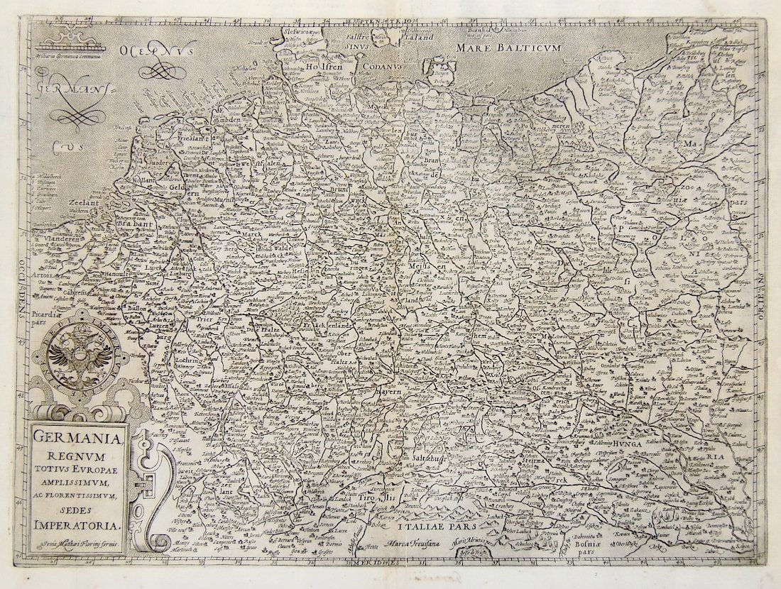 Acquaforte e bulino, circa 1600. Rara carta derivante dalla grande mappa della Germania di Gerard Mercator. Bellissima prova assai contrastata, impressa su carta vergata coeva, con margini, un piccolo restauro alla piega centrale, perfetto stato di conservazione. Florimi, allievo di Antonio Lafrery e Claudio Duchetti, si trasferisce a Siena dove inizia la sua fiorente attività di editore fino al 1612. Per le caratteristiche peculiari delle sue opere e per la loro rarità, queste vengono classificate tra le carte di scuola lafreriana. Molto rara. Etching and engraving, circa 1600. Very good proof, printed on contemporary laid paper, with margins, little restoration at bottom centerfold but extremely good condition. The cartographic informations derived from Gerard Mercator. Florimi, a pupil of Antonio Lafrery & Claudio Duchetti, moved to Siena, where he settled as an editor until 1612. All works by Florimi are rare and can be classified as Lafrery school.