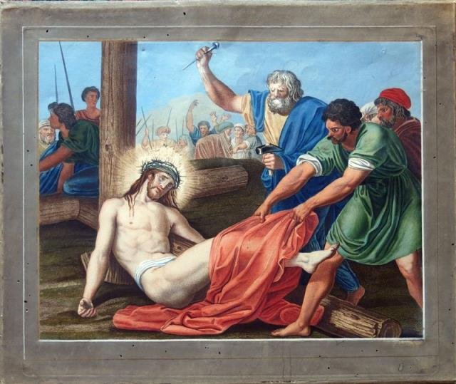 Scena tratta dalla crocifisissione, incisione in rame all'acquaforte, 1800 circa, cm 40 x 47 circa più margini (alla lastra), coloritura d'epoca, margini colorati in goauche. Alcune sciupature e piccoli lavori di di tarlo lungo i margini, bella la coloritura.
