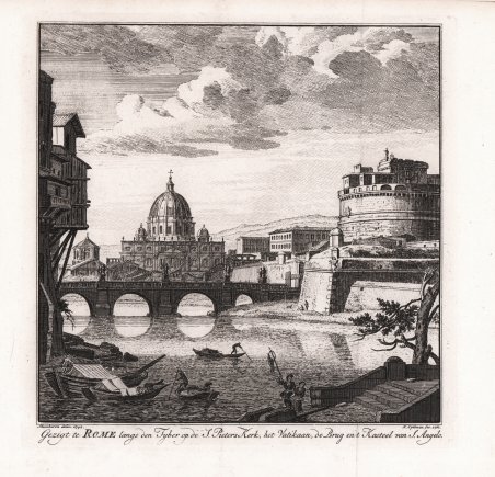 Veduta di Roma Hendrik Spilman, ripresa da un dipinto di Isaac de Moucheron (1670-1784) del 1742. Hendrik Spilman (1721, Amsterdam - 1784, Haarlem) è stato un pittore e incisore del XVIII secolo originario dei Paesi Bassi settentrionali. Trascorse la sua vita lavorativa ad Haarlem, dove si iscrisse nel 1742 come membro della Corporazione di San Luca di Haarlem. Fu allievo di Abraham de Haen, che lo formò come pittore e disegnatore, ma è noto soprattutto per i suoi disegni topografici e le incisioni di paesaggi urbani e di edifici importanti. Oltre alle sue incisioni su disegni di de Haen, Jan de Beijer, Cornelis Pronk e Cornelis van Noorde, realizzò anche lavori per diverse pubblicazioni. Acquaforte, stampata su carta vergata coeva, con margini, piega centrale verticale, altrimenti ottimo stato di conservazione. Rara View of Rome Hendrik Spilman after a painting by Isaac de Moucheron (1670- 1784) dated 1742. Hendrik Spilman (1721, Amsterdam – 1784, Haarlem), was an 18th-century painter and engraver from the Northern Netherlands. He spent his working life in Haarlem, where he enrolled in 1742 as a member of the Haarlem Guild of Saint Luke. He was a pupil of Abraham de Haen, who trained him as a painter and draughtsman, but he is best known for his topographical drawings and engravings of cityscapes and important buildings. He made engravings after drawings by de Haen, Jan de Beijer, Cornelis Pronk, and Cornelis van Noorde in addition to his own work for various publications. Etching, printed on contemporary laid paper, with margins, e central fold, otherwise very good condition. Rare. Cfr.