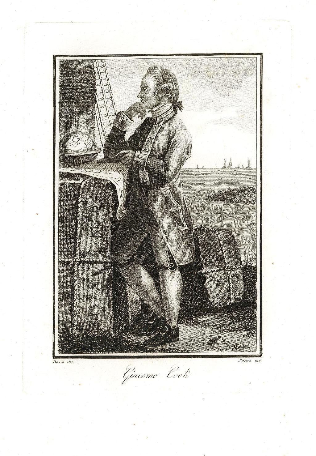 Stampa antica originale raffigurante il ritratto di Giacomo Cook nato a Morton nella contea di York nel 1728, in allegato pagina descrittiva. Inserita nell'opera "Serie di vite e ritratti de Famosi Personaggi degli ultimi Tempi" edita da Bettalli e Fanfani a Milano dal 1815 al 1818