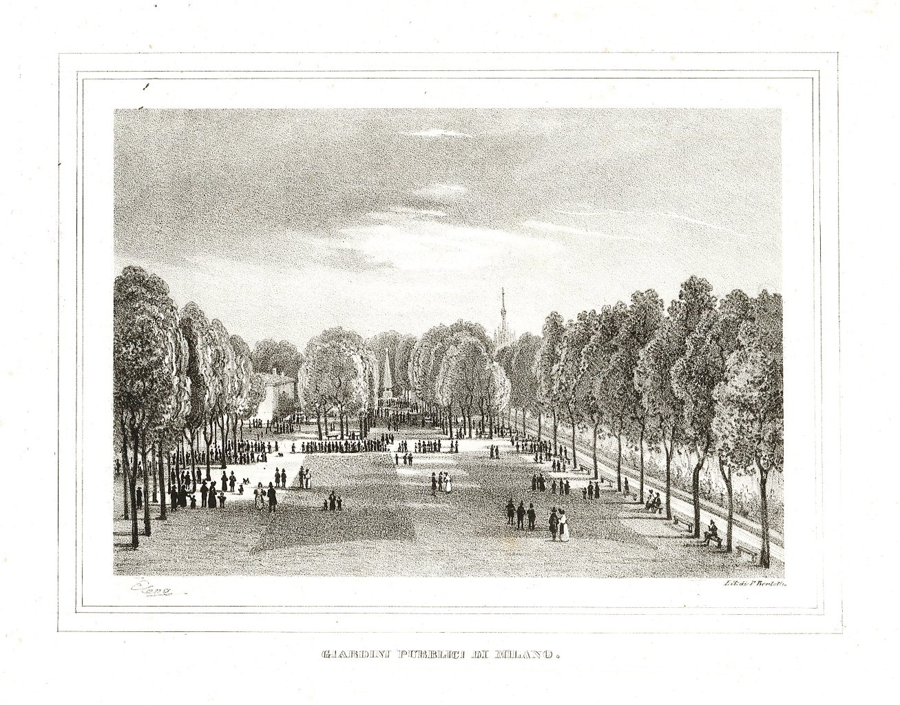 Stampa antica ed originale dei Giardini Pubblici in Milano animati da cittadini a passeggio