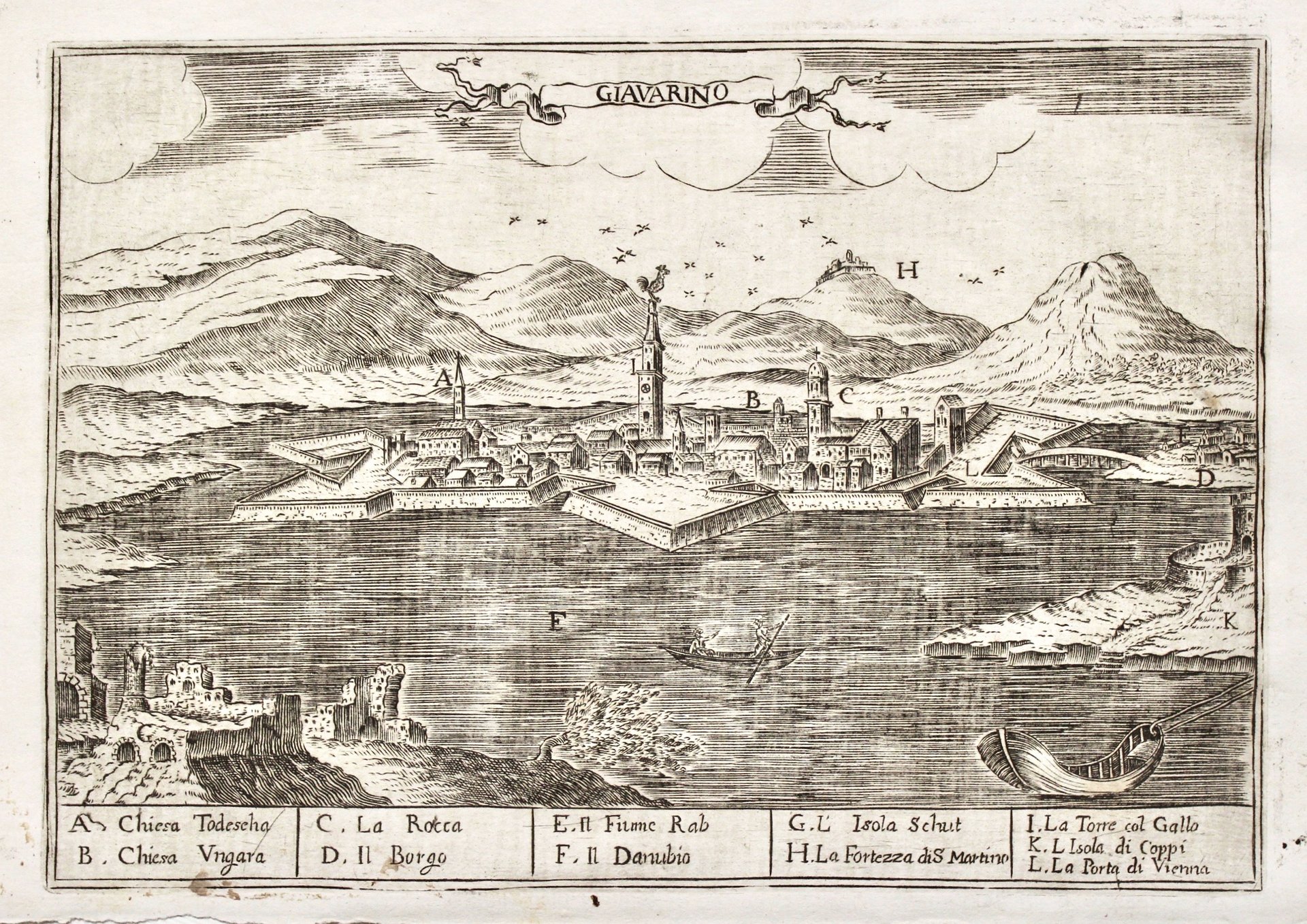 Incisione in rame, mm 140x200. Veduta prospettica della città di Györ in Ungheria.Tratta da “Diario della campagna fatta in Ungheria”. Buon esemplare con il margine inferiore un po’ corto.