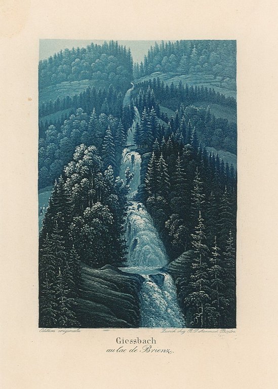 Stampa, antica ed originale, raffigurante la cascata di Giessbach sul Lago di Brienz in raffinata acquatinta stampata in due colori. Inserita nell'opera "Souvenir de la Suisse" edita a Zurigo. Autore: Dikenmann Rudolf dis. (1793 Zürich 1883). Luogo: Lago di Brienz CH. Anno: 1860 ca. Tecnica: acquatinta. Dimensioni: 74x112 mm