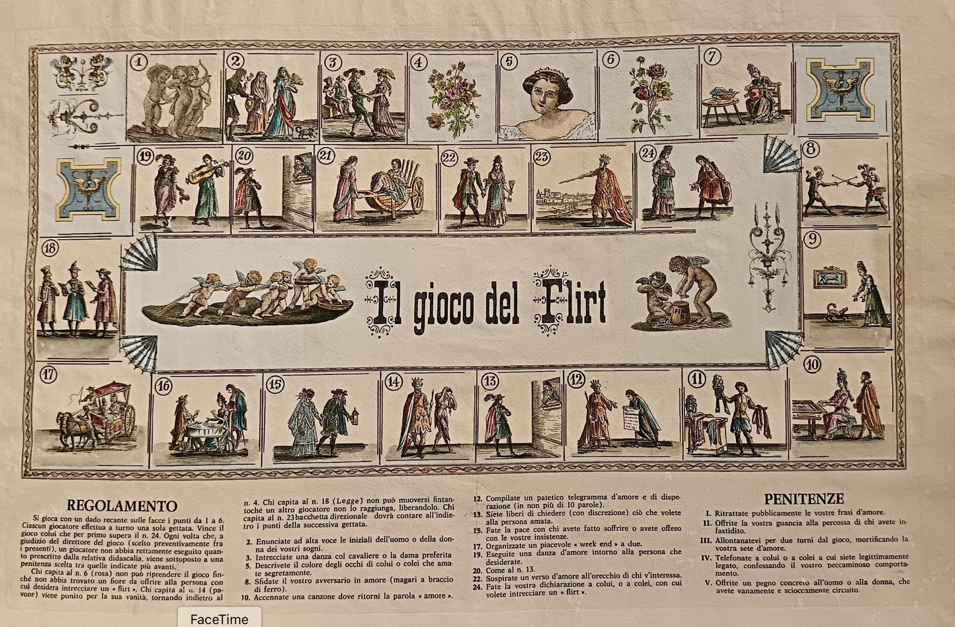 Divertente variante in stile ottocentesco del classico gioco dell'oca. Il percorso animato da figurette in abiti settecenteschi prevede azioni che, se non rettamente eseguite, vengono tramutate in altrettanti punizioni.