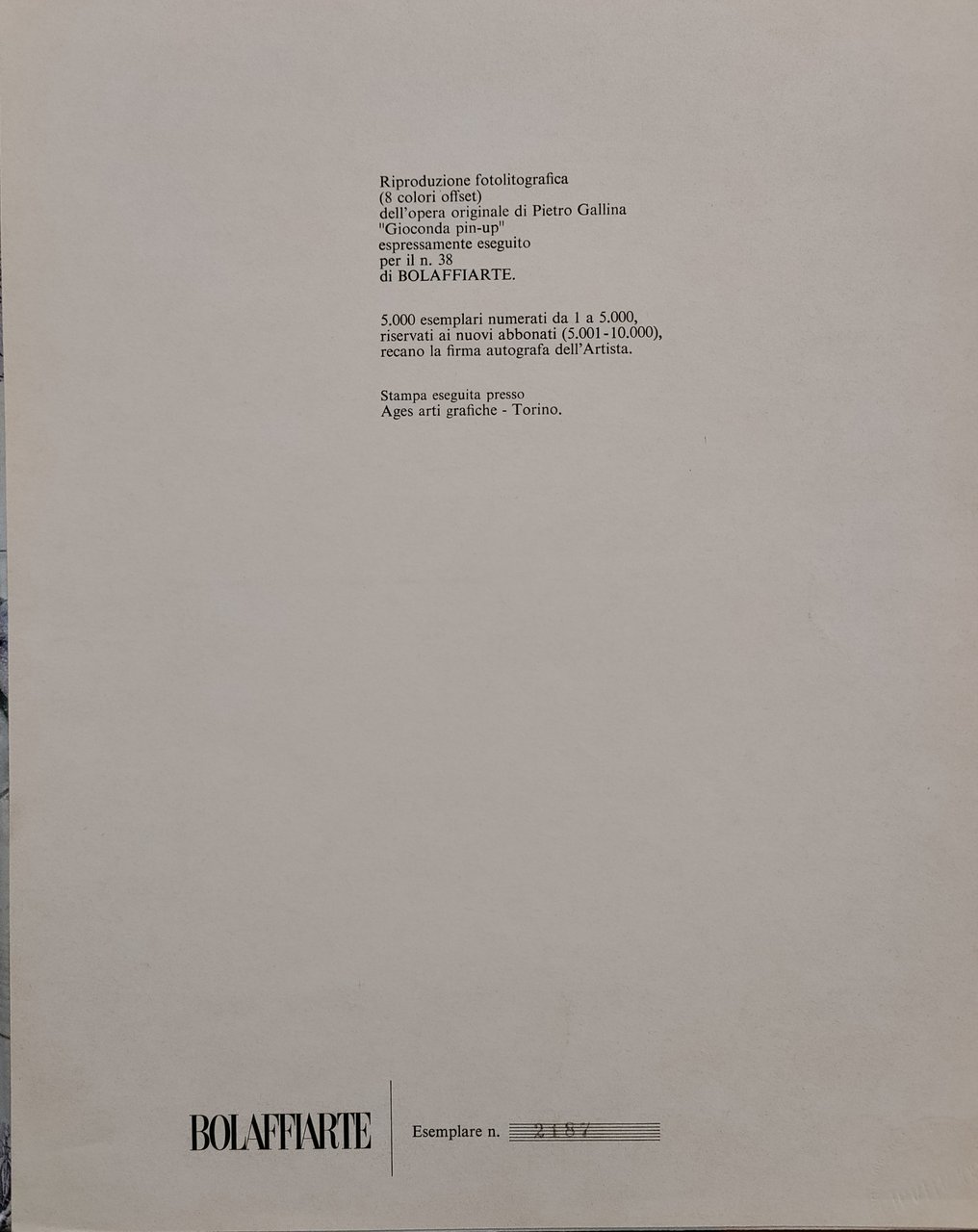 Riproduzione fotolitografica (8colori offset) dell'opera originale di Pietro Gallina eseguita per i n. 38 di BOLAFFIARTE