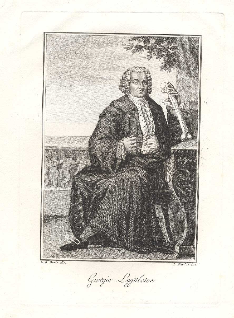 Cm. 15x22 (al vivo), incisione originale su rame, ritratto del medico George Lygttleton. In buono stato (good copy).