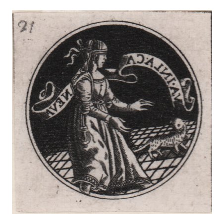 Sul nastro, al contrario: VA?INLA?CA.NEVA Copia, nello stesso verso, di un niello della collezione Durazzo (n. 2834), di cui una impressione originale è ora a Parigi, Louvre, collezione Cabinet Rothschild. Questa stampa può essere approssimativamente assegnata all'Italia settentrionale, e in particolare a Bologna. Zanetti e Dutuit ritengono che il dialetto dell'iscrizione sia quello di Venezia e, di conseguenza, attribuiscono l'opera alla scuola veneziana. Le parole Va inla caneva sono probabilmente emiliane invece. Il soggetto è enigmatico. I nielli della collezione Durazzo vennero fatti riprodurre in incisioni proprio dal proprietario, tra fine XVIII e inizio XIX secolo, a Venezia - come specificato anche dal Malaspina nel suo catalogo del 1824 - costituendo una serie che venne diffusa e collezionata dagli amatori. Bartsch descrive queste copie nel suo volume edito nel 1811, data che quindi costituisce il terminus ante quem per l'esecuzione. On the scroll, in reverse: VA?INLA?CA…NEVA Copy, on the same verso, of a niello print formerly kept in the Durazzo collection (n. 2834), now in Paris, Louvre, Cabinet Rothschild collection. This print can be tentatively assigned to northern Italy, and specifically to Bologna. Zanetti and Dutuit believed the dialect of the inscription to be that of Venice and accordingly attributed the piece to the Venetian school. The words Va inla caneva are probably Emilian instead of, or in addition to, being Venetian. The subject is enigmatic. ' The nielli of the Durazzo collection were reproduced in engravings by the owner himself, between the end of the 18th and the beginning of the 19th century, in Venice - as also specified by Malaspina in his catalog of 1824 - constituting a series that was circulated and collected by amateurs. Bartsch describes these copies in his volume published in 1811, a date that therefore constitutes the terminus ante quem for the execution. Cfr. TIB 2401.021; Duchesne, p. 266, n. 326; Zanetti, pp. 102-103.
