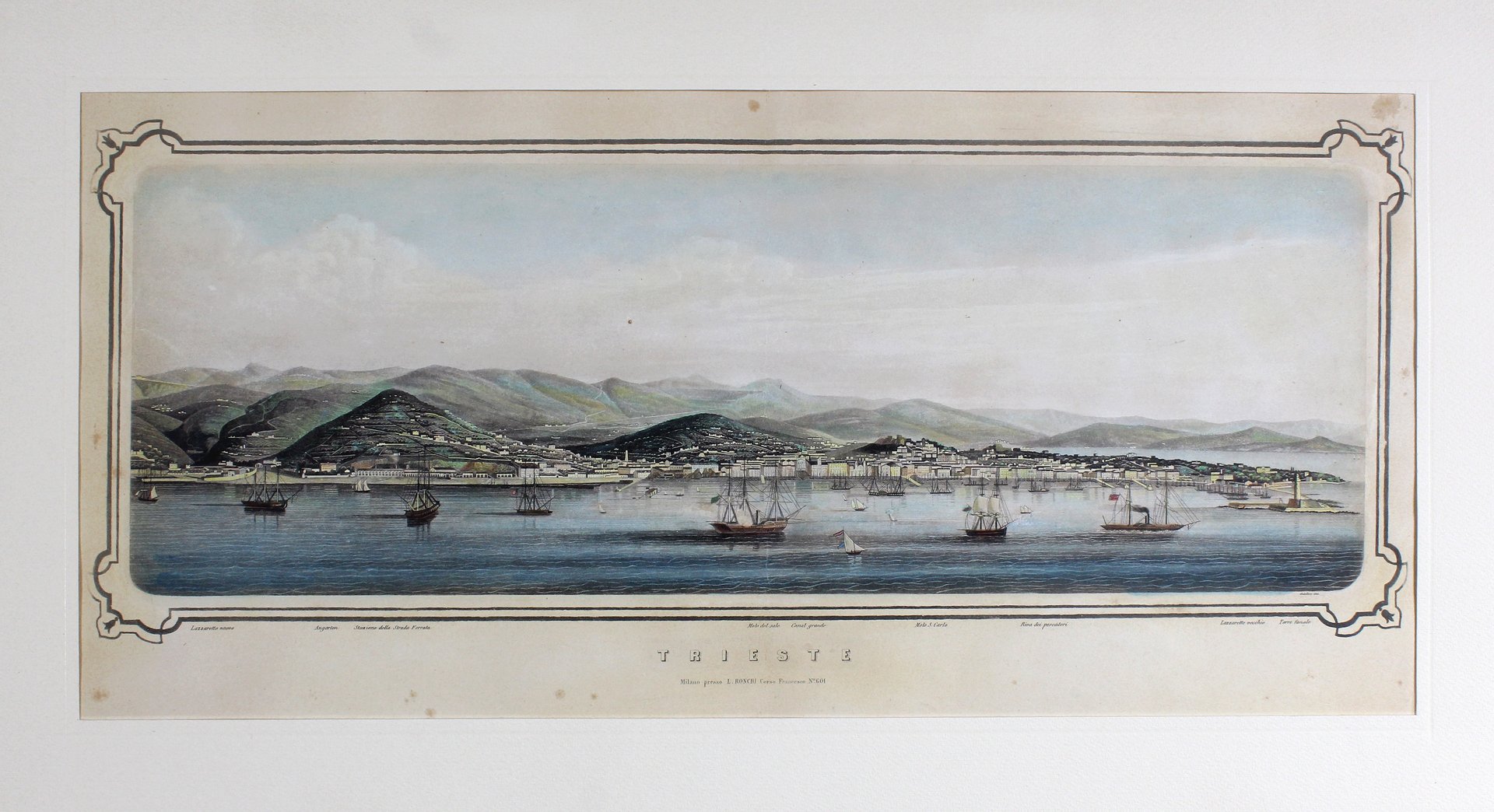 Rara veduta panoramica a colori della città di Trieste disegnata e incisa da Giuseppe Giudici, artista attivo a Milano nella seconda metà del secolo XIX e stampata da Ronchi nel 1860.