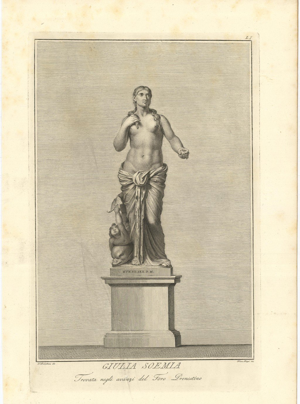 Questa statua, con sfondo inciso, raffigura Giulia Soemia (180 d.C. - 222 d.C.), madre dell'imperatore romano Eliogabalo, governò sull'Impero durante la minore età del figlio. Figlia di Giulio Avito e di Giulia Mesa, fu nipote del sovrano Settimio Severo. La figura è rappresentata nelle vesti di Venere, è vestita da un drappo dalla vita sino ai piedi, ha due ciocche di capelli che le carezzano il collo. Le vesti, il delfino e Cupido ai suoi piedi sono propri della dea Venere. Inserita nell'opera "Il Museo Pio-Clementino descritto da Ennio Quirino Visconti - Tomo secondo - Dedicato alla Santità di Nostro Signore PIO SESTO Pontefice Massimo. Edita da Ludovico Mirri / Mercante di quadri incontro il Palazzo Bernini. In Roma MDCCLXXXIV con Privilegio Pontificio. Foxing
