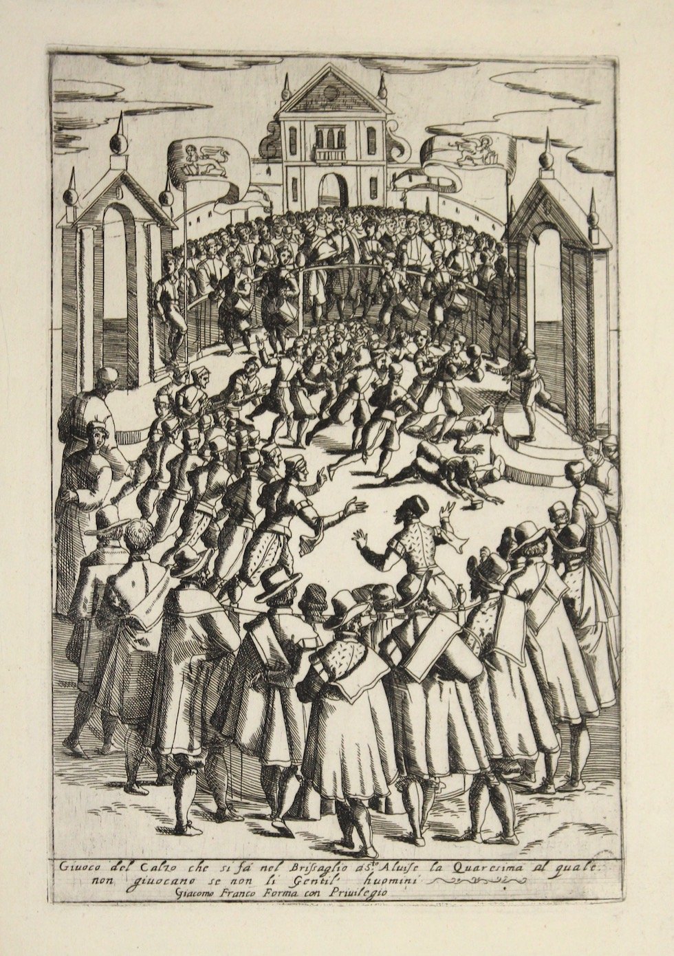 Acquaforte, ottima impressione su carta vergata, mm 252x170, firmata "Giacomo Franco Forma con privilegio" in basso, tratta dalla raccolta "Habiti d'huomeni et donne veneziane…Trionfi Feste Cerimonie pubbliche della mobilissima città di Venetia", che si proponeva di illustrare in ogni aspetto la vita cittadina, inclusi i giochi che dividevano la cittadinanza in due squadre. La raccolta venne pubblicata dopo il 1591, anno in cui Franco ottenne il privilegio di stampa dal senato. Foglio in ottime condizioni con ampi margini.
