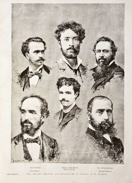 Ritratti dei pittori premiati: Nicolò Barabino, Francesco Paolo Michetti, Giov. Battista Quadrone, Cesare Maccari, Giacomo Favretto, Francesco Jacovacci. Testo al verso