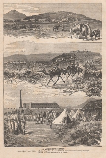 Tre vignette: 1. Forte di Keren e campo cintato - 2. Fortino di Agordat - 3. Interno del forte di Cassala e avanzi dello sgranatojo Munzinger. Testo al retro