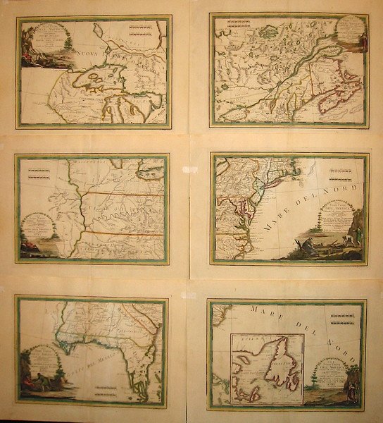 Carta geografica originale composta da sei fogli (ciascuno di cm. 49,5x37 più ampi margini bianchi). Provenienza: ‘Nuovo Atlante Geografico Universale delineato sulle ultime osservazioni’ pubblicato dalla Calcografia Camerale tra il 1792 ed il 1801. Bella coloritura coeva all’acquarello. Carta filigranata. Esemplare in eccellente stato di conservazione. Rara a trovarsi completa. Questi i titoli degli altri cinque fogli, ognuno entro cartiglio decorativo: 2. ‘Parte della Nuova Inghilterra ed inoltre la Nuova Scozia e porzione del Canada’, 3. ‘Parte della Virginia e della Carolina’, 4. ‘Parte della Nuova Inghilterra, la Nuova York, il Nuovo Yersey, la Pensilvania, il Delaware, il Maryland, e porzioni della Virginia, e della Carolina’, 5. ‘La Georgia, e parte della Carolina con la Florida’, 6. ‘Parte della Carolina ed inoltre l’Isola di Terranuova colle altre Isole del Golfo di S. Lorenzo’.