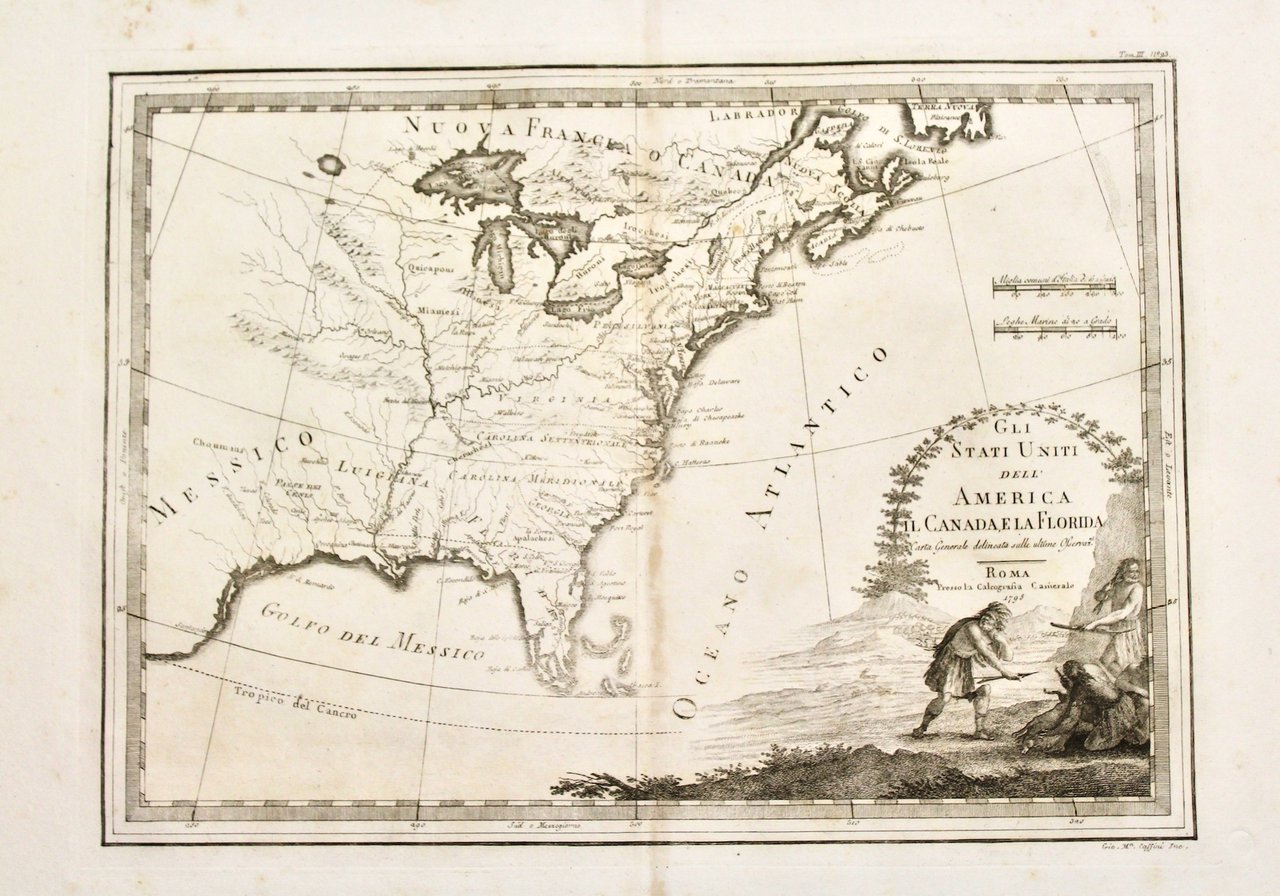 Incisione in rame, mm 345x478. Non comune carta degli Stati Uniti del Sud. Ottimo esemplare marginoso con molto lieve alone centrale. Tratta da "Nuovo Atlante Geografico Universale delineato sulle ultime osservazioni edito a Roma dal 1792 fino al 1801. La Calcografia Camerale gli commissionò l'opera per sostituire il "Mercurio Geografico". Giovanni Maria Cassini (1745-1824), allievo di Piranesi, fu religioso, geografo, costruttore di globi e cartografo. <BR>Copper engraving, mm 345x478. Scarce map the south east of the States. From "Nuovo Atlante Geografico Universale delineato sulle ultime osservazioni", printed in Rome form 1792 to 1801. Very good conditon, just a very light paper discoloration at centerfold<BR>