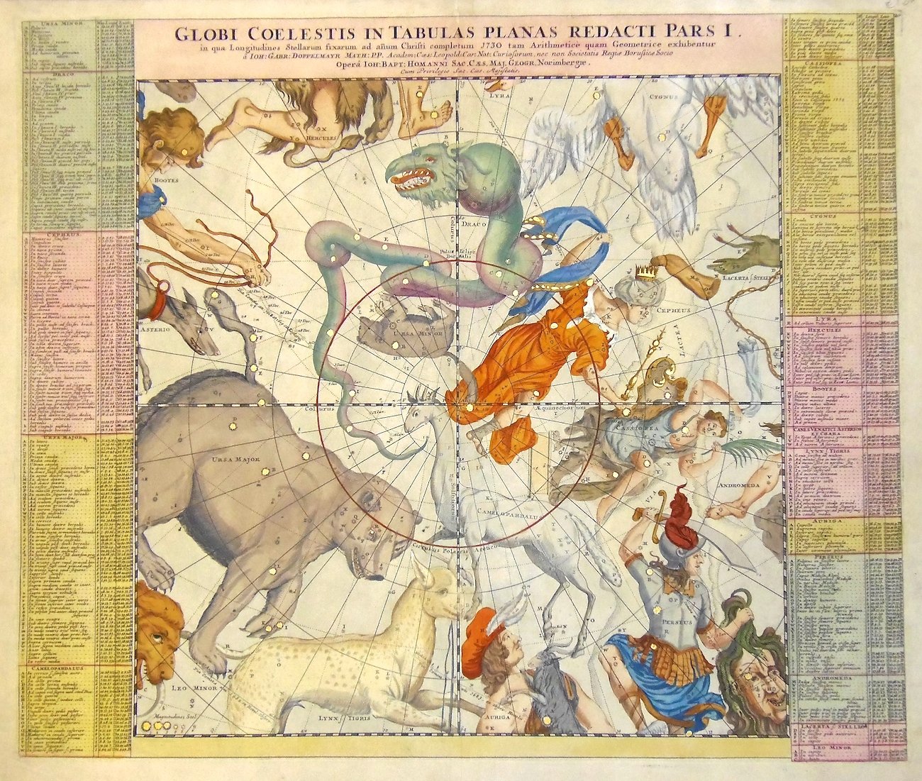 Incisione in rame di mm 500x590, colorata a mano d'epoca con finiture recenti, tratta da "Atlas coelestis". Bella carta astronomica con la raffigurazione mitologica delle costellazioni. Ai lati l'elenco delle stelle fisse divise per costellazione con le loro coordinate. J. G. Doppelmayr (1677-1750) fu un matematico, astronomo e cartografo tedesco .<BR>Ottimo esemplare con minimo restauro alla parte superiore della piega centrale.<BR>