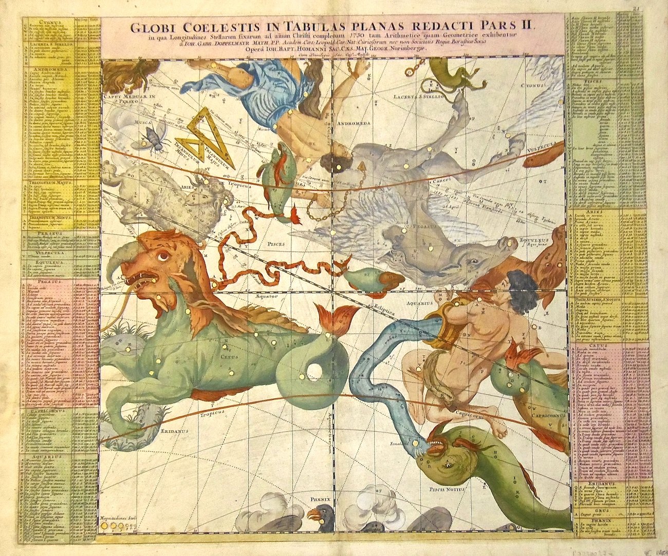 Incisione in rame di mm. 490x580 colorata a mano d'epoca con ritocchi, tratta dall'opera "Atlas coelestis". Doppelmayr (1677-1750) fu un matematico, astronomo, e cartografo tedesco. Bellissima tavola astronomica che raffigura la rappresentazione mitologica di alcune costellazioni e le coordinate astronomiche delle stelle fisse costituenti tali costellazioni. Qualche restauro a difetto marginale e alla giuntura centrale dei fogli.