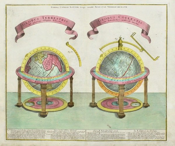 Incisione in rame, mm 490x583, coloritura originale d'epoca, titolo su nastri in alto. In basso quattro riquadri con spiegazioni tecniche in latino e tedesco dei due globi. Da "Atlas novus" o "Grosser Atlas". Bell'esemplare in splendida coloritura; perfetto stato di conservazione.<BR>Lotter proseguì nell'attività di Seutter utilizzando spesso le medesime lastre con minime variazioni, ma pubblicando anche materiale inedito spesso assai decorativo e a volte raro. Le sue carte hanno sempre colori brillanti e cartigli elaborati come quelle di Seutter, che dopo un apprendistato presso Homann a Norimberga, trasferitosi ad Augsburg verso il 1720, aprì la propria attività superando il maestro sotto il profilo della bellezza.<BR>Copperplate, original colour, mm 490x583. At bottom technical descriptions in latin and german of the two globes. From "Atlas novus" and "Grosser Atlas".<BR>Very good condition. Lotter run then the business using mostly Seutter's plates but adding some new ones also. Seutter, after having worked with Homann in Nuremberg, opened his own activity in Augsburg around 1720. His maps always have elaborate cartouches and are very decorative and printed on good paper. Lotter married Seutter's daughter in 1740 and succeeded him in 1756. <BR><BR>