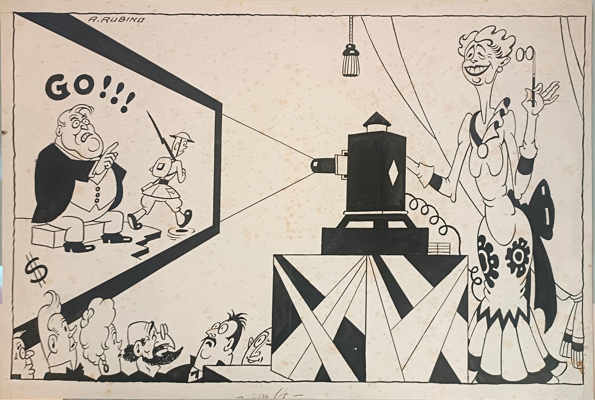Il soggetto rappresenta una scena di interno con una proiezione cinematografica, ambiente ben noto all'autore. Rubino infatti, negli anni Quaranta, si dedica al cinema realizzando tra gli altri i film: Il paese dei ranocchi e Crescendo rossiniano. Gli spettatori sono uomini e donne adulte, vestiti da sera, come se dovessero assistere ad una rappresentazione importante. Sullo schermo è seduto un uomo grasso, ai suoi piedi il simbolo del dollaro, probabilmente rappresenta il mondo della finanza, dell'industria o della politica. Con la destra, indice sollevato, invita un giovane magro soldato a partire: GO! L'elemetto e la divisa paioni quelli dell'Esercito inglese durante la II GM. E' curioso che la proiezione sia proposta da una vecchia signora. Il proiettore è posto sopra un tavolo decorato a motivi Art Decò. In alto a sinistra A. RUBINO. Il disegno è stato certamente un'illustrazione per la testata nata nel 1915, Eco della Riviera. L'illustrazione è databile agli anni trenta. In basso oltre l'immagine la scritta per la pubblicazione: cm 14. Al verso timbro "Giornale/L'Eco della Riviera/Sanremo"