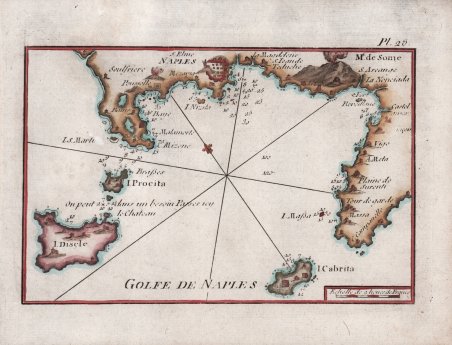 Carta ' nautica del Golfo di ' Napoli tratta dal celebre ' Recueil des principaux plans des ports et rades de la mer méditerranée estraits de ma carte en douze feuilles, dédiée à Monseigneur le Duc de Choiseul ministre de la guerre et de la marine. ' Par son très humble serviteur Joseph Roux, hydrographe du roy. A Genes chez Yves Gravier Libraire sous la Loge de Banchi. 1779. Seconda edizione, accresciuta, di questa celebre raccolta di piani nautici del Mediterraneo, completa di 123 incisioni in rame che mostrano le piante dei principali porti o rade del Mediterraneo, con scandagli, possibili ancoraggi, la natura dei fondali, così come le città, fortificazioni, cittadelle, arsenali e fari ad essi collegati. Ogni mappa ha una scala in leghe, ' toises ' o miglia di Provenza. Questa importante raccolta, la più completa e precisa per la sua epoca, è dovuta a Joseph Roux. I Roux di Marsiglia erano una famiglia di idrografi e pittori specializzati in ritratti di uomini di mare e navi. Joseph Roux nacque nel 1725, da Joseph Roux l'Ancien (1682-1742), che lavorava come idrografo, e Magdaleine Senequier. Fu suo padre che aprì un negozio idrografico nel porto di Marsiglia nel 1708, sotto l’insegna ' La Boussole Couronnée. ' Joseph Roux le Jeune, è conosciuto come l'inventore del genere del ritratto di nave, un genere che fu perfezionato dalle tre generazioni successive. Si dedicò subito all’attività di famiglia, diventando idrografo come suo padre, producendo, pubblicando e vendendo un vasto assortimento di carte nautiche e strumenti di navigazione. Intorno alla metà del secolo, ricevette l’onorificenza di ' Hidrographe du Roy ' e, nel 1764, pubblicò una serie di 12 carte del Mediterraneo, un atlante nautico che venne usato per un certo numero di anni, persino sulle navi inglesi. Contemporaneamente, pubblicò la prima edizione – che comprendeva 65 tavole di formato tascabile – del ' Recueil des principaux plans des ports et rades de la mer méditerranée ' (Marsiglia 1764), successivamente ristampato - ampliato - a Genova da Yves Gravier nel 1779 e infine, con il titolo ' Recueil de 163 principaux plans des ports et rades ' de la Mediterranée, ' nel 1804. Per tutto il XIX secolo, seguirono svariate edizioni, alcune ampliate, sia in Francia sia in Italia. Alcune a cura dello stesso Roux, mentre altre erano copie non autorizzate. Acquaforte, in ottimo stato di conservazione. Bibliografia National Maritime Museum, III, n. 269; cfr. P. C. F. Smith, ' The Artful Roux: Marine Painters of Marseille, Peabody Museum of Salem, 1978; Nordenskiöld 254. Carta ' nautica del Golfo di ' Napoli ' tratta dal celebre ' Recueil des principaux plans des ports et rades de la mer méditerranée estraits de ma carte en douze feuilles, dédiée à Monseigneur le Duc de Choiseul ministre de la guerre et de la marine. ' Par son très humble serviteur Joseph Roux, hydrographe du roy. A Genes chez Yves Gravier Libraire sous la Loge de Banchi. 1779. Seconda edizione, accresciuta, di questa celebre raccolta di piani nautici del Mediterraneo, completa di 123 incisioni in rame che mostrano le piante dei principali porti o rade del Mediterraneo, con scandagli, possibili ancoraggi, la natura dei fondali, così come le città, fortificazioni, cittadelle, arsenali e fari ad essi collegati. Ogni mappa ha una scala in leghe, ' toises ' o miglia di Provenza. Questa importante raccolta, la più completa e precisa per la sua epoca, è dovuta a Joseph Roux. I Roux di Marsiglia erano una famiglia di idrografi e pittori specializzati in ritratti di uomini di mare e navi. Joseph Roux nacque nel 1725, da Joseph Roux l'Ancien (1682-1742), che lavorava come idrografo, e Magdaleine Senequier. Fu suo padre che aprì un negozio idrografico nel porto di Marsiglia nel 1708, sotto l’insegna ' La Boussole Couronnée. ' Joseph Roux le Jeune, è conosciuto come l'inventore del genere del ritratto di nave, un genere che fu perfezionato dalle tre generazioni successive. Si dedicò subito all’attività di famiglia, diventando idrografo come suo padre, producendo, pubblicando e vendendo un vasto assortimento di carte nautiche e strumenti di navigazione. Intorno alla metà del secolo, ricevette l’onorificenza di ' Hidrographe du Roy ' e, nel 1764, pubblicò una serie di 12 carte del Mediterraneo, un atlante nautico che venne usato per un certo numero di anni, persino sulle navi inglesi. Contemporaneamente, pubblicò la prima edizione – che comprendeva 65 tavole di formato tascabile – del ' Recueil des principaux plans des ports et rades de la mer méditerranée ' (Marsiglia 1764), successivamente ristampato - ampliato - a Genova da Yves Gravier nel 1779 e infine, con il titolo ' Recueil de 163 principaux plans des ports et rades ' de la Mediterranée, ' nel 1804. Per tutto il XIX secolo, seguirono svariate edizioni, alcune ampliate, sia in Francia sia in Italia. Alcune a cura dello stesso Roux, mentre altre erano copie non autorizzate. Acquaforte, in ottimo stato di conservazione. Bibliografia National Maritime Museum, III, n. 269; cfr. P. C. F. Smith, ' The Artful Roux: Marine Painters of Marseille, Peabody Museum of Salem, 1978; Nordenskiöld 254. Cfr.