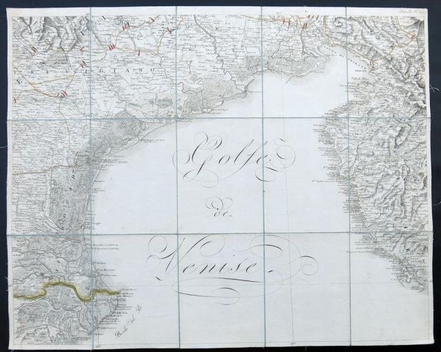 Dalla “Carta Amministrativa del Regno d’Italia co' suoi stabilimenti politici, militari, civili e religiosi e con una parte degli stati limitrofi. Costrutta nel Deposito della Guerra per ordine del Ministro della Guerra e Marina nell'anno MDCCCXI, aggiunta e corretta nell'anno 1813”, edita a Milano nel 1813 (una grande carta composta da più fogli quadrettati e applicati su tela d'epoca, ciascuno di cm 54 x 67 circa per un perimetro totale di cm 1400 x 1100 circa), bella carta del Golfo di Venezia; sono segnalate le Bocche del Po, il Golfo di Trieste e Capodistria, giù fino a Rovigno, Dignano e Fasana. La carta è composta da un foglio, numerato come foglio XIV sulla parte incisa, e con il numero 14 al retro della tela. Benedetto e Gaudenzio Bordiga furono incisori e cartografi, originari della Valsesia e attivi a Milano nella prima metà del XIX secolo, un periodo caratterizzato da alterne vicende storico politiche, in cui realizzarono un discreto corpus incisorio. L'opera più importante cui contribuirono fu la “Carte générale du Théâtre de la Guerre en Italie”, una grande carta commissionata, nel 1797 dallo Stato Maggiore dell'Armata Francese di Napoleone, al capo battaglione Bacler d'Albe, capo del Gabinetto Cartografico Francese: la carta, celebrativa della prima campagna d'Italia, fu in gran parte realizzata a partire da carte preesistenti, fu realizzata in cinquantaquattro fogli sotto la direzione di Giacomo Pinchetti e fu appunto incisa dai fratelli Benedetto (1800 - 1834) e Gaudenzio Bordiga. Gaudenzio Bordiga (Camasco, Varallo, 10 febbraio 1773 – Milano, 18 gennaio 1837), seguì a Varallo studi letterari e di disegno. Stabilitosi a Milano con il fratello Benedetto, fu capo incisore dell'Istituto Geografico Militare e mantenne tale carica anche dopo l'occupazione austriaca. Senza la collaborazione del fratello Bendetto, Gaudenzio disegnò, e a volte incise, varie carte geografiche militari (“Carta delle stazioni militari in Italia”, 1804; “Carta militare del Regno d'Etruria e del principato di Lucca”, 1806) e scrisse opere di erudizione storico – artistica (“Notizie intorno alle opere di Gaudenzio Ferrari, pittore e plasticatore”, Milano, G. Pirotta, 1821; “Storia e guida del Sacro Monte di Varallo“, Varallo, 1830). Molto buono lo stato di conservazione.