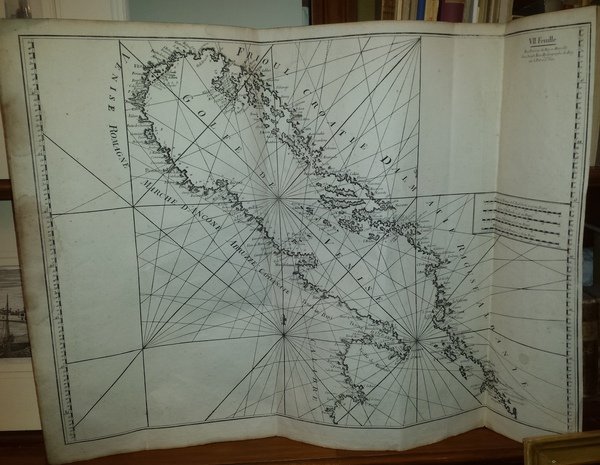 Incisione in rame su foglio di 820 x 595 mm. Dettagliata carta nautica del Golfo di Venezia dove sono segnate città costiere, profondità ed ancoraggi dell'Adriatico. In alto a destra dentro battuta "VII Feuille. Avec Privilege du Roy a Marseille. Chez Joseph Roux Hydrographe du Roy sur le Port a St. Jean". Proveniente da: "Recueil des principaux plans, des ports, et rades de la mer Mediterranèe. . Par son trés humble Serviteur Joseph Roux Hydrographe du Roy. Marsiglia 1764". Lieve alone di gora al margine sinistro. Raro ed in ottime stato di conservazione. (EN) Copper engraving on sheet of 820 x 595 mm. Detailed nautical chart of the Gulf of Venice where coastal cities, depths and anchorages of the Adriatic are marked. Top right inside line "VII Feuille. Avec Privilege du Roy a Marseille. Chez Joseph Roux Hydrographe du Roy sur le Port a St. Jean". Coming from: "Recueil des principaux plans, des ports, et rades de la mer Mediterranèe. . Par son trés humble Serviteur Joseph Roux Hydrographe du Roy. Marseille 1764". Slight stain on the left margin. Rare and in excellent condition.