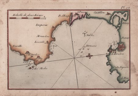 Piano nautico tratto dal " Recueil des principaux plans des ports & rades de la Méditerranée" di Josepgh Roux, pubblicato per la prima volta a Marsiglia nel 1764 e successivamente ristampato - ampliato - a Genova da Yves Gravier con il titolo "Recueil de 163 principaux plans des ports et rades de la Mediterranée" (1804).Ulteriore edizione dell'opera, con il titolo "Plans des ports ed des rades de la Mer Méditerranée." è stampata a Livorno da Carlo Tesi nel 1858. Incisione in rame, finemente acquarellata a mano, in ottimo stato di conservazione. First published in the "Recueil des principaux plans des ports et rades de la Mer Mediterranee", 1764, this nice nautical chart is taken from the rare "Plans des ports ed des rades de la Mer Méditerranée." published in Leghorn by Carlo Tesi, 1858. Copperplate with fine colouring, in very good condition. Cfr.