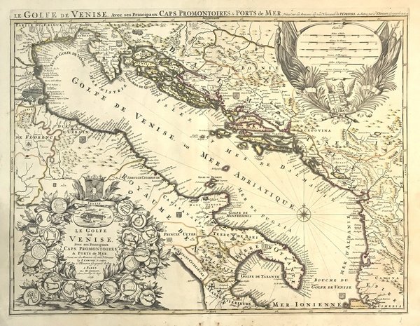 Grande carta geografica originale colorata a mano, raffigurante l'insieme del Mar Adriatico con i possedimenti della Repubblica di Venezia. Ricco cartiglio e dettagliata rappresentazione dei territo