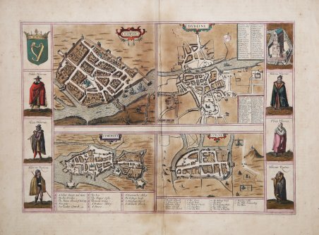 Foglio con quattro piante a volo d'uccello di città irlandesi: Galway, Dublino, Limerick e Cork. Bordi a sinistra e a destra con figure in costume tipico; in alto a destra “Enis Kelling Fort”. Le quattro vedute sono realizzate sulla base delle mappe di John Speed in The Theatre of the Empire of Great Britain, 1611. Tavola tratta dal Civitates Orbis Terrarum. Theatri praecipuarum Totius Mundi Urbium Liber Sextus Anno MDCXVIII. Colonia, Anton Heirat, 1617-18. L’opera è inserita nel ' Civitates Orbis Terrarum, il primo atlante devoto esclusivamente alle piante e vedute delle principali città del mondo. ' Il primo volume delle ' Civitates Orbis Terrarum ' fu pubblicato a Colonia nel 1572. Il sesto e ultimo volume apparve nel 1617. Questo grande atlante di città – cartografia urbana - curato da Georg Braun e inciso in gran parte da Franz Hogenberg, conteneva 546 prospettive, vedute a volo d'uccello e vedute cartografiche di città di tutto il mondo. Franz Hogenberg realizzò le tavole dei primi quattro volumi e Simon van den Neuwel (Novellanus, attivo dal 1580) quelle dei volumi V e VI. Georg Braun (1541-1622), un ecclesiastico di Colonia, fu il principale redattore dell'opera e fu molto aiutato nel suo progetto dalla vicinanza e dal continuo interesse di Abraham Ortelius, il cui ' Theatrum Orbis Terrarum ' del 1570 fu, come raccolta sistematica e completa di mappe di stile uniforme, il primo vero atlante. Le ' Civitates, ' in effetti, erano destinate ad accompagnare il ' Theatrum, ' come indicato dalla somiglianza dei titoli e dai riferimenti contemporanei sulla natura complementare delle due opere. Tuttavia, le ' Civitates ' erano progettate per avere un approccio più popolare, senza dubbio perché la novità di una raccolta di piante e vedute di città rappresentava un'impresa commerciale più rischiosa di un atlante mondiale, per il quale c'erano stati diversi precedenti di successo. Franz Hogenberg (1535-1590) era figlio di un incisore di Monaco che si era stabilito a Malines. Incise la maggior parte delle tavole del ' Theatrum ' di Ortelius e la maggior parte di quelle delle ' Civitates, e potrebbe essere anche indicato come il responsabile dell'origine del progetto. Oltre un centinaio di artisti e cartografi diversi, il più importante dei quali fu l'artista di Anversa Georg Hoefnagel (1542-1600), fornirono i disegni per le tavole delle ' Civitates. Hoefnagel non solo contribuì alla maggior parte del materiale originale per le città spagnole e italiane, ma rielaborò e modificò anche quello di altri collaboratori. Dopo la morte di Hoefnagel, il figlio Jakob continuò il lavoro per le ' Civitates. Gli autori della raccolta si proponevano di raffigurare "non icones et typi urbium", cioè non immagini generiche e tipizzate, "sed urbes ipsae admirabili caelaturae artificio, spectantium oculis subiectae appareant": non intendeva alludere o idealizzare, ma rappresentare fedelmente sulla carta, riprodurre esattamente, e in tempo reale, ciò che l'occhio vede, come annunciato nella prefazione al primo volume delle ' Civitates Orbis Terrarum. Incisione in rame, finemente colorata a mano, piccoli difetti alla piega centrale, per il rsto in ottimo stato di conservazione. Bibliografia Van der Krogt 4, n. 1437. Antique map with four Irish bird's-eye view plans by Georg Braun and Frans Hogenberg: Galway, Dublin, Limerick and Cork. Left and right borders with costumed figures. Top right view of 'Enis Kelling Fort'. The four views are made after maps by John Speed in ' The Theatre of the Empire of Great Britain, 1611. Plate taken from the sixth volume of Civitates Orbis Terrarum. Theatri praecipuarum Totius Mundi Urbium Liber Sextus Anno MDCXVIII. Cologne, Anton Heirat, 1617-18. (Van der Krogt 4, 41:1.6) The ' Civitates Orbis Terrarum is the first atlas devoted exclusively to plans and views of the world's major cities. Printed in six volumes between 1572 and 1617 it was so successful and widespread that several editions translated into Latin, German and French were printed. The first volume of the ' Civitates Orbis Terrarum ' was published in Cologne in 1572. The sixth and the final volume appeared in 1617. This great city atlas, edited by Georg Braun and largely engraved by Franz Hogenberg, eventually contained 546 prospects, bird-eye views and map views of cities from all over the world. Fransz Hogenberg produced the plates for the first four books, and Simon van den Neuwel (Novellanus, active since 1580) those for volumes V and VI. Georg Braun (1541-1622), a cleric of Cologne, was the principal editor of the work, and was greatly assisted in his project by the close, and continued interest of Abraham Ortelius, whose ' Theatrum Orbis Terrarum ' of 1570 was, as a systematic and comprehensive collection of maps of uniform style, the first true atlas. The ' Civitates, ' indeed, was intended as a companion for the ' Theatrum, ' as indicated by the similarity in the titles and by contemporary references regarding the complementary nature of two works. Nevertheless, the ' Civitates ' was designs to be more popular in approach, no doubt because the novelty of a collection of city plans and views represented a more hazardous commercial undertaking than a world atlas, for which there had been a number of successful precedents. Franz Hogenberg (1535-1590) was the son of a Munich engraves who settled in Malines. He engraved most of the plates for Ortelius's ' Theatrum ' and the majority of those in the ' Civitates, and may have been responsible for originating the project. Over a hundred of different artists and cartographers, the most significant of whom was Antwerp artist Georg Hoefnagel (1542-1600), engraved the cooper-plates of the ' Civitates ' from drawings. He not only contributed most of the original material for the Spanish and Italian towns but also reworked and modified those of other contributors. After Hoefnagel's death his son Jakob continued the work for the Civitates. The autho