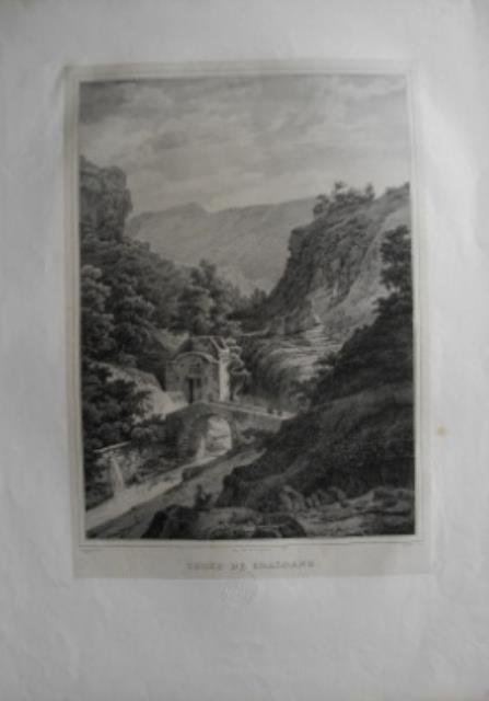 Lith. de Langlumé, 1840 circa. Litografia, cm 38,2 x 26,9 (la parte figurata) più margini. Disegnata dal Coignet e litografata dallo Jacollet. Piacevole scena animata da figure in costume in uno scorcio roccioso con ponte. Buono stato.