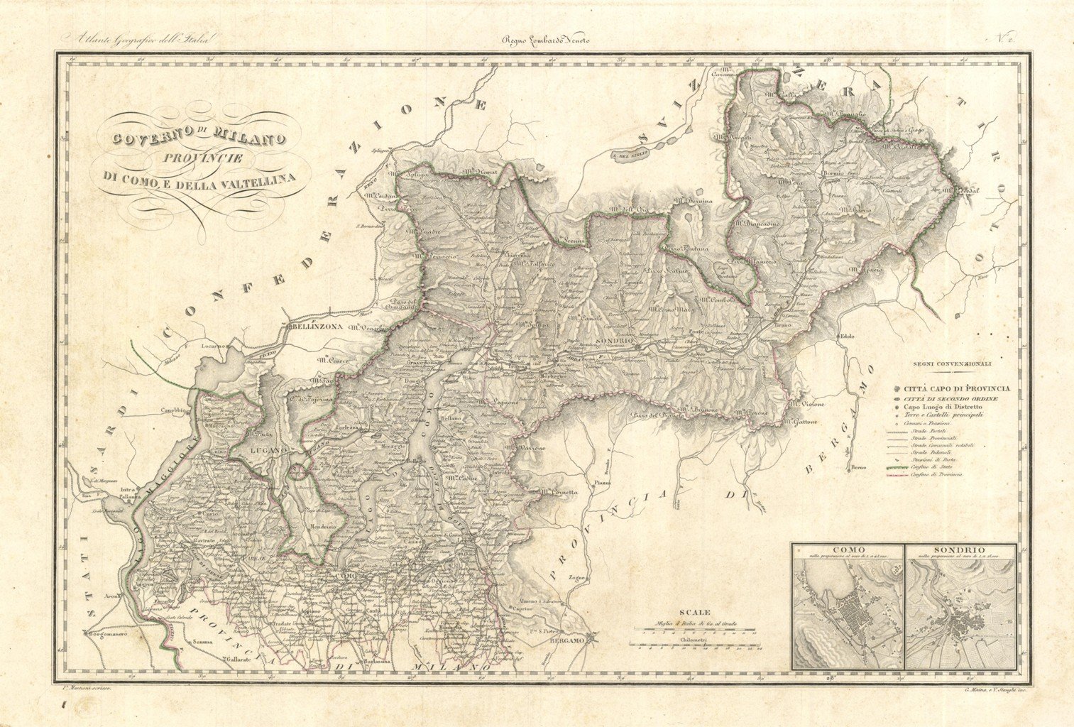Carta geografica, antica ed originale, con rappresentazione delle provincie di Varese, Como, Lecco e Sondrio. In basso a destra, entro riquadri, le piantine planimetriche delle città di Como e Sondrio. Inserita nel I volume dell'opera "Atlante Geografico degli Stati Italiani delineato sopra le migliori e più moderne mappe per servire di corredo alla Corografia Fisica Storica e Statistica dell'Italia" contenente le carte dell'Italia Superiore. Descritta da Attilio Zuccagni-Orlandini, edita e stampata a Firenze nel 1844-45. Autore: Zuccagni - Orlandini edit. & G. Maina e V. Stanghi inc. Luogo: Como - Sondrio. Anno: 1844. Tecnica: incisione in rame. Dimensioni: 336x521 mm. L'incisione è caratterizzata da una coloritura coeva ai confini