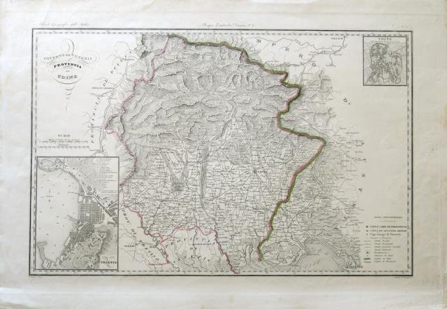 Tratta dall’atlante “Atlante geografico, fisico - storico, corografico dell’Italia”, Firenze, 1842 – 1845. Incisione in rame, b/n (confini in colore d’epoca), cm 43,1 x 61,2 (il foglio). La carta appartiene al regno Lombardo Veneto. In basso, a ds., una legenda con i principali segni convenzionali. Buono stato di conservazione.