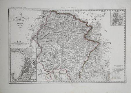 Carta geografica tratta dall’Atlante geografico degli Stati italiani delineato sopra le migliori e più moderne mappe per servire di corredo alla corografia fisica storica e statistica dell'Italia, di Attilio Zuccagni Orlandini stampato a Firenze, presso gli editori, 1844. In 2° massimo, 2 voll. Il primo volume contenente le carte dell’Italia Superiore in 52 fogli, il secondo volume quelle dell’Italia Inferiore in 77 fogli. Attilio Zuccagni Orlandini (1784-1872) nacque a Fiesole con il nome di Giuseppe Orlandini. In seguito all’adozione da parte del facoltoso zio materno Attilio Zuccagni (1754-1807), botanico e georgofilo, assunse il nome di Attilio Zuccagni Orlandini. La sua più importante opera è la relazione geografico-cartografica di tutti gli Stati preunitari italiani, la grandiosa Corografia fisica, storica e statistica dell’Italia e delle sue Isole (Firenze 1835-1845), in dodici volumi per diciannove tomi, con un volume introduttivo sull’intera penisola italiana. L’opera costituì la summa delle centinaia di opere geografiche generali, regionali e locali allora disponibili e presentava, per ogni Stato preunitario, la trattazione fisica, storica, topografica e un inquadramento statistico. Nel 1844-45, la Corografia fu arricchita con cinque volumi di cartografie, vedute e altre illustrazioni di luoghi e monumenti: Atlante geografico degli Stati italiani delineato sopra le migliori e più moderne mappe (due volumi con 144 tavole inclusa la grande carta della penisola in 15 fogli) e Atlante illustrativo ossia raccolta dei principali monumenti italiani antichi, del medio evo e moderni e di alcune vedute pittoriche (tre volumi con 413 illustrazioni, stampate su 269 fogli). Le tavole furono incise, sempre a Firenze, in due apposite officine, da quattro valenti artisti lombardi (Vittorio Angeli, Giacinto Maina, Pietro Manzoni e Giuseppe Pozzi). ' Soprattutto il primo dei due atlanti rappresenta, ancora oggi, una pietra miliare nella storia della cartografia e dell’iconografia geografica italiana. Fu veramente ‘un’ardua impresa’, dal momento che spesso mancavano ancora (come, ad esempio, per il Ducato di Lucca e lo Stato Pontificio) prodotti cartografici compiutamente geometrici. I due prodotti furono presentati ai Georgofili nel 1843 e nel 1844, insieme alla mappa della Repubblica di San Marino. L’opera si rivelò oltremodo costosa e non ottenne il successo commerciale sperato, ma servì da base per tante altre iniziative editoriali successive che vi attinsero, talora senza neppure rispettarne i diritti d’autore. Incisione in rame, coloritura coeva dei contorni, lievi ossidazioni, per il resto in ottimo stato di conservazione. ' Bibliografia Cfr. Anna Guarducci - Dizionario Biografico degli Italiani - Volume 100 (2020). Map taken from the Atlante geografico degli Stati italiani delineato sopra le migliori e più moderne mappe per servire di corredo alla corografia fisica storica e statistica dell'Italia, di Attilio Zuccagni Orlandini printed in Florence, 1844. The first volume contains the maps of Northern Italy in 52 sheets, the second volume those of Southern Italy in 77 sheets. Attilio Zuccagni Orlandini (1784-1872) was born in Fiesole under the name of Giuseppe Orlandini. Following adoption by his wealthy maternal uncle Attilio Zuccagni (1754-1807), a botanist and georgofile, he took the name Attilio Zuccagni Orlandini. His most important work is the geographic-cartographic report of all the pre-unification Italian states, the great Corografia fisica, storica e statistica dell'Italia e delle sue Isole (Florence 1835-1845), in twelve volumes for nineteen tomes, with an introductory volume on the entire Italian peninsula. The work constituted the sum of hundreds of general, regional and local geographic works then available and presented, for each pre-unification state, the physical, historical, topographical and statistical framework. In 1844-45, the Corografia was enriched with five volumes of maps, views and other illustrations of places and monuments: Atlante geografico degli Stati italiani delineato sopra le migliori e più moderne mappe (two volumes with 144 plates including the large map of the peninsula in 15 sheets) and Atlante illustrativo ossia raccolta dei principali monumenti italiani antichi, del medio evo e moderni e di alcune vedute pittoriche (three volumes with 413 illustrations, printed on 269 sheets). The plates were engraved, again in Florence, in two special workshops, by four talented Lombard artists (Vittorio Angeli, Giacinto Maina, Pietro Manzoni and Giuseppe Pozzi). ' Especially the first of the two atlases represents, even today, a milestone in the history of cartography and Italian geographic iconography. It was truly 'an arduous undertaking', since cartographic products were often still lacking (as, for example, for the Duchy of Lucca and the Papal States) fully geometric. The two products were presented to the Georgofili in 1843 and 1844, along with the map of the Republic of San Marino. The work proved to be very expensive and did not achieve the commercial success hoped for, but served as a basis for many other subsequent publishing initiatives that drew on it, sometimes without even respecting the copyright. ' Copperplate with fine outline colour, good condition. ' Literature Anna Guarducci - Dizionario Biografico degli Italiani - Volume 100 (2020). Cfr.