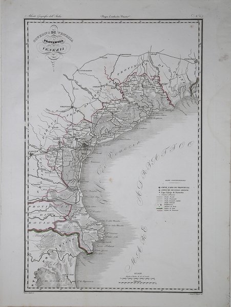 Carta geografica tratta dall’Atlante geografico degli Stati italiani delineato sopra le migliori e più moderne mappe per servire di corredo alla corografia fisica storica e statistica dell'Italia, di Attilio Zuccagni Orlandini stampato a Firenze, presso gli editori, 1844. In 2° massimo, 2 voll. Il primo volume contenente le carte dell’Italia Superiore in 52 fogli, il secondo volume quelle dell’Italia Inferiore in 77 fogli. Attilio Zuccagni Orlandini (1784-1872) nacque a Fiesole con il nome di Giuseppe Orlandini. In seguito all’adozione da parte del facoltoso zio materno Attilio Zuccagni (1754-1807), botanico e georgofilo, assunse il nome di Attilio Zuccagni Orlandini. La sua più importante opera è la relazione geografico-cartografica di tutti gli Stati preunitari italiani, la grandiosa Corografia fisica, storica e statistica dell’Italia e delle sue Isole (Firenze 1835-1845), in dodici volumi per diciannove tomi, con un volume introduttivo sull’intera penisola italiana. L’opera costituì la summa delle centinaia di opere geografiche generali, regionali e locali allora disponibili e presentava, per ogni Stato preunitario, la trattazione fisica, storica, topografica e un inquadramento statistico. Nel 1844-45, la Corografia fu arricchita con cinque volumi di cartografie, vedute e altre illustrazioni di luoghi e monumenti: Atlante geografico degli Stati italiani delineato sopra le migliori e più moderne mappe (due volumi con 144 tavole inclusa la grande carta della penisola in 15 fogli) e Atlante illustrativo ossia raccolta dei principali monumenti italiani antichi, del medio evo e moderni e di alcune vedute pittoriche (tre volumi con 413 illustrazioni, stampate su 269 fogli). Le tavole furono incise, sempre a Firenze, in due apposite officine, da quattro valenti artisti lombardi (Vittorio Angeli, Giacinto Maina, Pietro Manzoni e Giuseppe Pozzi). ' Soprattutto il primo dei due atlanti rappresenta, ancora oggi, una pietra miliare nella storia della cartografia e dell’iconografia geografica italiana. Fu veramente ‘un’ardua impresa’, dal momento che spesso mancavano ancora (come, ad esempio, per il Ducato di Lucca e lo Stato Pontificio) prodotti cartografici compiutamente geometrici. I due prodotti furono presentati ai Georgofili nel 1843 e nel 1844, insieme alla mappa della Repubblica di San Marino. L’opera si rivelò oltremodo costosa e non ottenne il successo commerciale sperato, ma servì da base per tante altre iniziative editoriali successive che vi attinsero, talora senza neppure rispettarne i diritti d’autore. Incisione in rame, coloritura coeva dei contorni, lievi ossidazioni, per il resto in ottimo stato di conservazione. ' Bibliografia Cfr. Anna Guarducci - Dizionario Biografico degli Italiani - Volume 100 (2020). Map taken from the Atlante geografico degli Stati italiani delineato sopra le migliori e più moderne mappe per servire di corredo alla corografia fisica storica e statistica dell'Italia, di Attilio Zuccagni Orlandini printed in Florence, 1844. The first volume contains the maps of Northern Italy in 52 sheets, the second volume those of Southern Italy in 77 sheets. Attilio Zuccagni Orlandini (1784-1872) was born in Fiesole under the name of Giuseppe Orlandini. Following adoption by his wealthy maternal uncle Attilio Zuccagni (1754-1807), a botanist and georgofile, he took the name Attilio Zuccagni Orlandini. His most important work is the geographic-cartographic report of all the pre-unification Italian states, the great Corografia fisica, storica e statistica dell'Italia e delle sue Isole (Florence 1835-1845), in twelve volumes for nineteen tomes, with an introductory volume on the entire Italian peninsula. The work constituted the sum of hundreds of general, regional and local geographic works then available and presented, for each pre-unification state, the physical, historical, topographical and statistical framework. In 1844-45, the Corografia was enriched with five volumes of maps, views and other illustrations of places and monuments: Atlante geografico degli Stati italiani delineato sopra le migliori e più moderne mappe (two volumes with 144 plates including the large map of the peninsula in 15 sheets) and Atlante illustrativo ossia raccolta dei principali monumenti italiani antichi, del medio evo e moderni e di alcune vedute pittoriche (three volumes with 413 illustrations, printed on 269 sheets). The plates were engraved, again in Florence, in two special workshops, by four talented Lombard artists (Vittorio Angeli, Giacinto Maina, Pietro Manzoni and Giuseppe Pozzi). ' Especially the first of the two atlases represents, even today, a milestone in the history of cartography and Italian geographic iconography. It was truly 'an arduous undertaking', since cartographic products were often still lacking (as, for example, for the Duchy of Lucca and the Papal States) fully geometric. The two products were presented to the Georgofili in 1843 and 1844, along with the map of the Republic of San Marino. The work proved to be very expensive and did not achieve the commercial success hoped for, but served as a basis for many other subsequent publishing initiatives that drew on it, sometimes without even respecting the copyright. ' Copperplate with fine outline colour, good condition. ' Literature Anna Guarducci - Dizionario Biografico degli Italiani - Volume 100 (2020). Cfr.