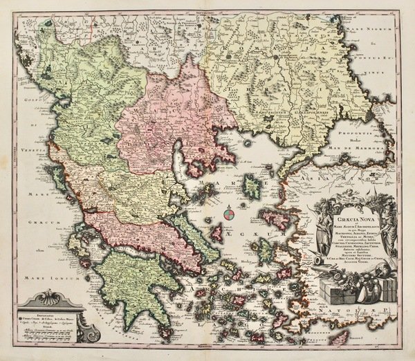 Graecia nova et mare Aegeum f. Archipelagus in qua mappa Macedonia, Albania, Epirus, Thessalia et Morea cum circumjacentibus insulis Corcyra, Cephalonia, Zachyntos