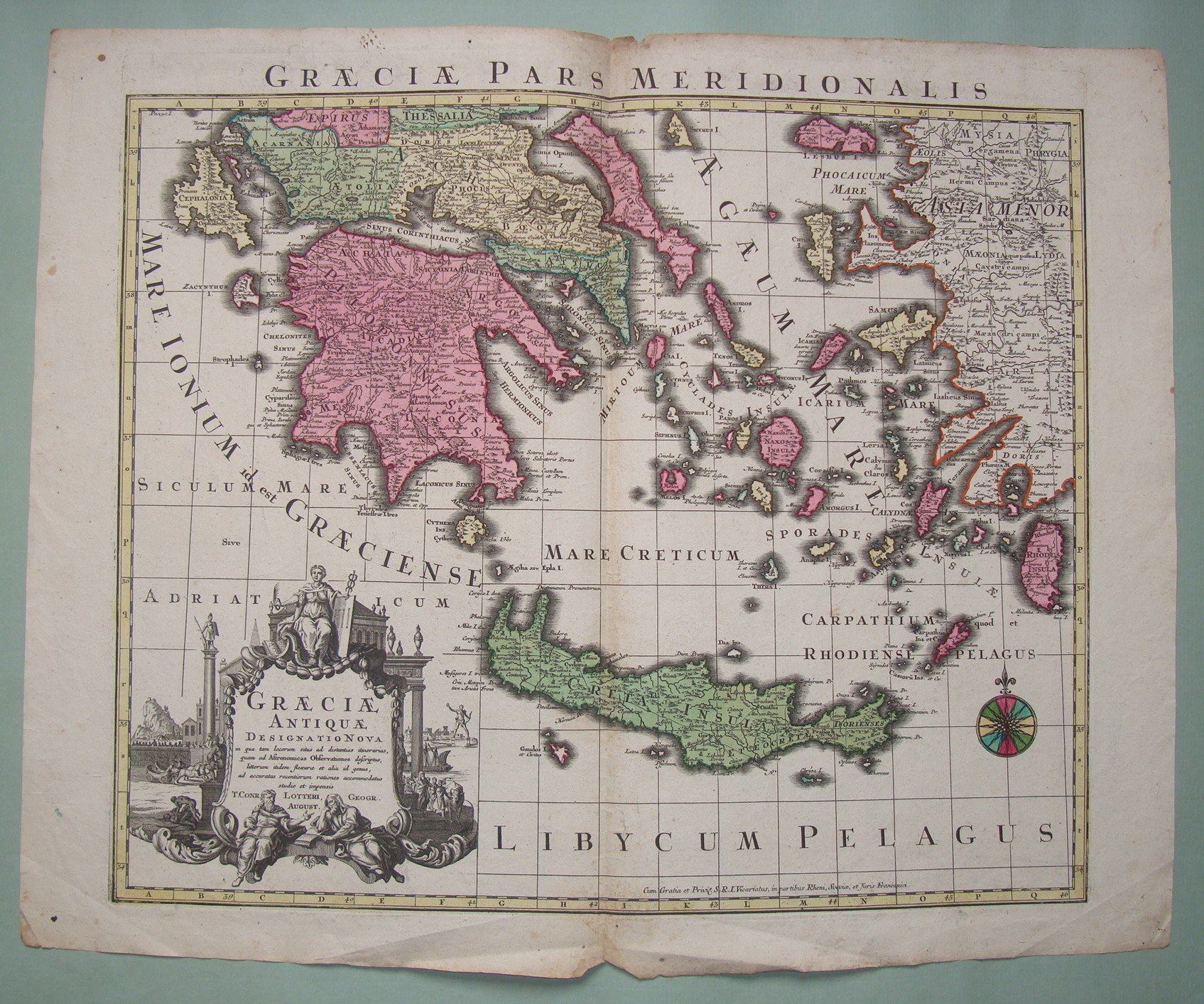 LOTTERUS. Graeciae antiquae designatio nova. 1750 ca. Double page engraved map by Lotterus. Original hand colours. Cm.48x57. Margins.