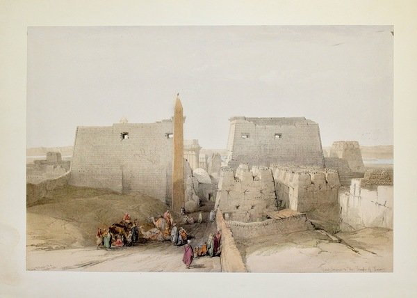 Litografia dipinta a mano, mm 350x505 applicata su cartoncino di supporto su foglio di mm 425x600.<BR>Tratta da "Egypt & Nubia", considerata assieme a The Holy Land (sempre dello stesso autore) la più grande opera illustrata in litografia di tutto il XIX secolo. Dopo aver compiuto studi d'arte e aver lavorato come pittore di scene teatrali in Glasgow e Londra, David Roberts (1796-1864) compì un lunghissimo viaggio che lo portò a visitare buona parte dell'Europa, del Medio Oriente e del Nord Africa, località affascinanti ed esotiche che lo colpirono particolarmente e che egli provvide a ritrarre in numerosi acquerelli. Tornato in Inghilterra, riuscì a pubblicare i dipinti presso l'editore Moon di Londra il quale, oltre a pagarlo profumatamente per la concessione dei diritti, lo assunse come supervisore all'opera di Louis Haghe, che doveva riprodurre gli originali in litografia. Questo è il giudizio che Roberts espresse sull'opera di Haghe: "Haghe has not only surpassed himself, but all that has hitherto been done of a similar nature. He has rendered the views in a style clear, simple and unlaboured, with a masterly vigour and boldness which none but a painter like him could have transferred to stone". La pubblicazione dell'opera ebbe un immediato e grandissimo successo, che contribuì non poco a collocare Roberts tra i più grandi pittori di paesaggi e di architetture.<BR>Abbey Travel I, 272: "One of the most important and elaborate ventures of nineteenth-century publishing, and.the apotheosis of the tinted lithograph".<BR>Bell'esemplare, con qualche piccola leggera macchia. <BR><BR>Tinted lithograph by Louis Haghe, coloured by hand, mounted on card in imitation of a watercolour (as issued). Good condition. mm 350x505, card mm 425x600.<BR>A fine example from the deluxe issue of David Roberts' monumental works on the Middle East: 'The Holy Land' and 'Egypt & Nubia', considered the greatest lithographically illustrated works issued in the 19th century. Abbey Travel I, 272: "One of the most important and elaborate ventures of nineteenth-century publishing, and.the apotheosis of the tinted lithograph<BR>