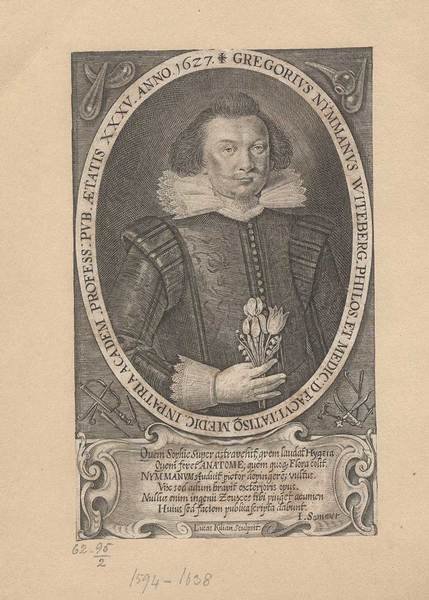 GREGORIUS NYMMANUS WITEBERG. PHILOS. ET MEDIC. D. FACULTATIS MEDIC. IN PATRIA ACADEM. PROFESS. PUB. AETATIS XXXV ANNO 1627.