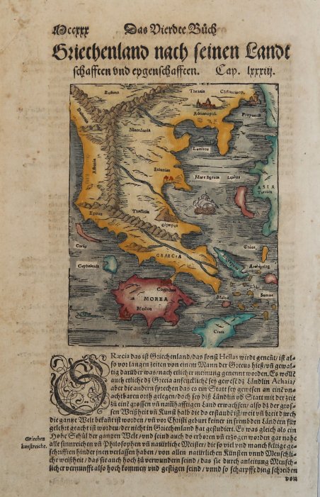Tavola tratta dalla ' Cosmographiae Universalis, edizione in tedesco, Basilea, seconda metà del XVI secolo.La ' Cosmographiae Universalis ' di Sebastian Münster (1488-1552), stampata per la prima volta Basilea nel 1544 dall’editore Heinrich Petri, venne più volte aggiornata e aumentata di nuove carte geografiche e rappresentazioni urbane nelle sue numerose edizioni che arrivano all’inizio del secolo successivo. Münster aveva lavorato a raccogliere informazioni al fine di ottenere un'opera che non deludesse le aspettative e, dopo un'ulteriore pubblicazione in tedesco abbellita da 910 stampe su legno, giunse nel 1550 all'edizione definitiva in latino, illustrata da 970 silografie. Vi furono poi numerose edizioni in diverse lingue, fra cui latino, francese, italiano, inglese e ceco. Dopo la sua morte di Münster (1552), Heinrich Petri prima, e il figlio Sebastian poi, continuarono la pubblicazione dell’opera. La ' Cosmographia universalis ' fu uno dei libri più popolari e di successo del XVI secolo, e vide ben 24 edizioni in 100 anni: l'ultima edizione tedesca venne pubblicata nel 1628, molto tempo dopo la morte dell'autore. La ' Cosmographia ' conteneva non solo le ultime mappe e vedute di tutte le città più famose, ma anche una serie di notizie enciclopediche di dettagli relative al mondo conosciuto, e sconosciuto. Il particolare successo anche commerciale di quest'opera fu dovuto in parte alle belle incisioni (tra i cui autori si possono citate Hans Holbein il Giovane, Urs Graf, Hans Rudolph Manuel Deutsch, David Kandel). Silografia, bella coloritura a mano, in buone condizioni. Plate taken from the ' Cosmographiae Universalis, German edition, Basel, second half of the 16th Century. The ' Cosmographiae Universalis ' of Sebastian Münster (1488-1552), printed for the first time in Basel in 1544 by the publisher Heinrich Petri, was updated several times and increased with new maps and urban representations in its many editions until the beginning of the next century. Münster had worked to collect information in order to obtain a work that did not disappoint expectations and, after a further publication in German embellished with 910 woodblock prints, arrived in 1550 to the final edition in Latin, illustrated by 970 woodcuts. There were then numerous editions in different languages, including Latin, French, Italian, English and Czech. After his death in Münster (1552), Heinrich Petri first, and then his son Sebastian, continued the publication of the work. The ' Cosmographia universalis ' was one of the most popular and successful books of the 16th century, and saw as many as 24 editions in 100 years: the last German edition was published in 1628, long after the author's death. The ' Cosmographia ' contained not only the latest maps and views of all the most famous cities, but also a series of encyclopedic details related to the known, and unknown, world. The particular commercial success of this work was due in part to the beautiful engravings (among whose authors can be mentioned Hans Holbein the Younger, Urs Graf, Hans Rudolph Manuel Deutsch, David Kandel). Woodcut, beautiful hand-coloring, in good condition. Cfr.