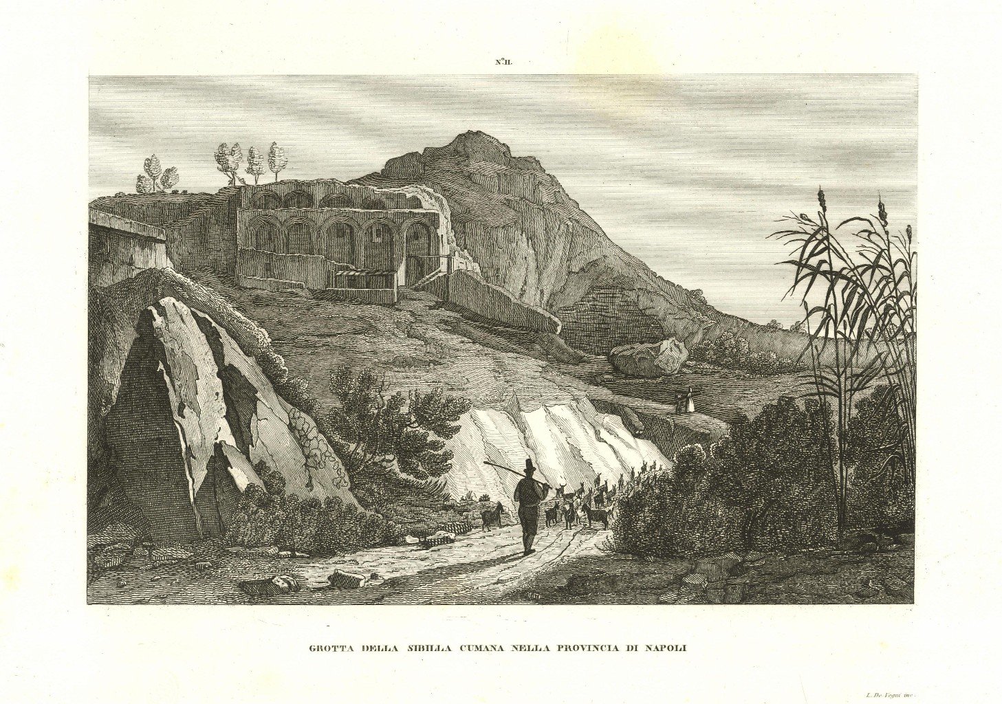 Veduta esterna della grotta della Sibilla cumana. Stampa antica originale