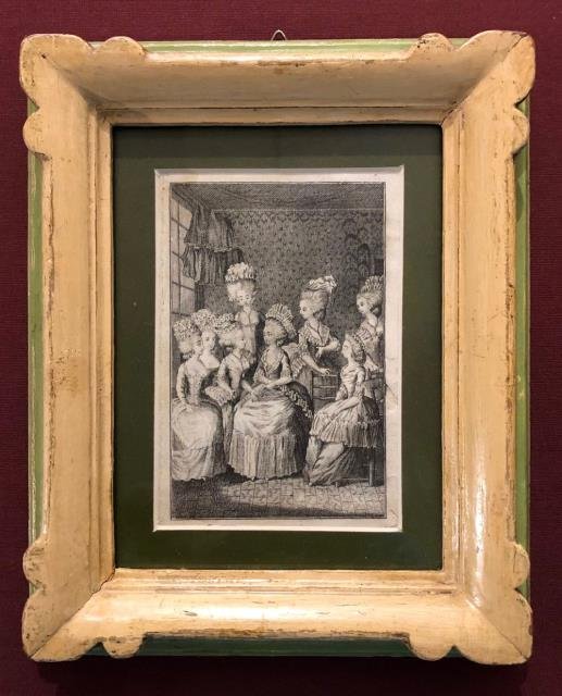 Senza indicazioni editoriali, 1780 circa. Incisione in rame all'acquaforte, cm 9 x 13 (il foglio). Piacevole scenetta di ambiente, sono ritratte sei giovani donne che conversano. Curioso e insolito il modo in cui sono state incise le posture, i visi e gli abiti, ciò rende la stampa molto originale. Con vecchia cornice in legno lavorata. Piccoli difetti e una breve mancanza al margine laterale destro sono stati riparati, buona impressione e buono lo stato di conservazione dell'insieme.