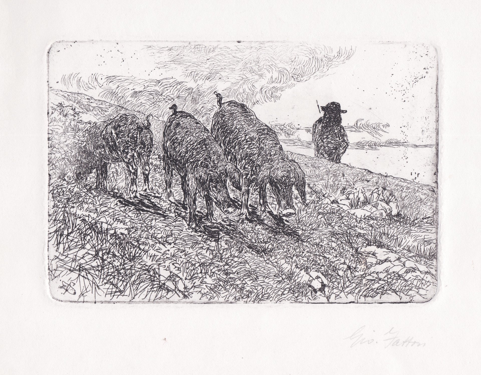 Nel foglio vengono rappresentati tre maiali al pascolo, il guardiano è colto di spalle più lontano oltre la linea della collina. Sigla GF incisa in basso a sinistra. Lastra databile al 1880-1885, periodo in cui Fattori comincia a misurarsi con l'incisone affrontando soggetti poco ambiziosi con segno sicuro e libero. Firma a matita in basso a destra probabilmente autografa. Nell'angolo inferiore sinistro timbro a secco rotondo: Collezione G Malesci - Giovanni Fattori e n 33 a matita. Al recto nell'angolo superiore destro n 21 a matita in grafia ottocentesca.