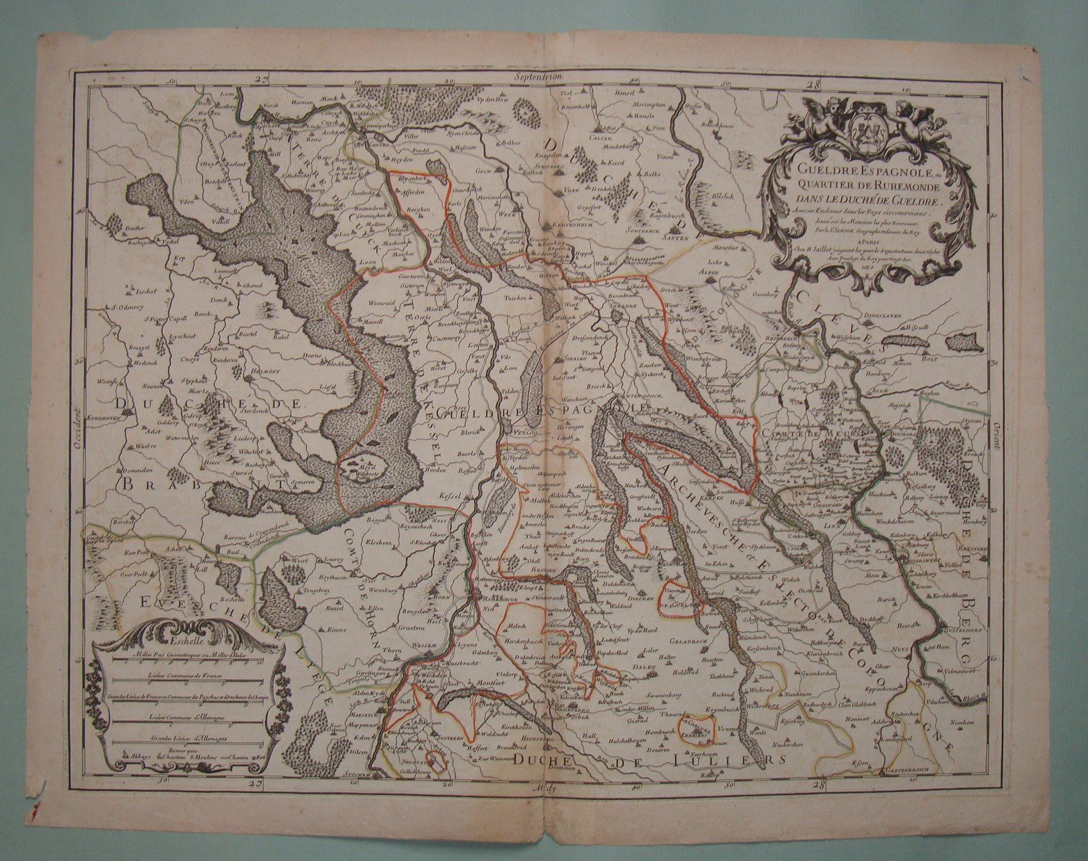 JAILLOT. Gueldre Espagnole ou Quartier de Ruremonde dans le Duché de Gueldre. Paris, 1674. Double page engraved map by Jaillot after Sanson. Contemp. hand coloured in outline. Cartouche. Cm.43x56.