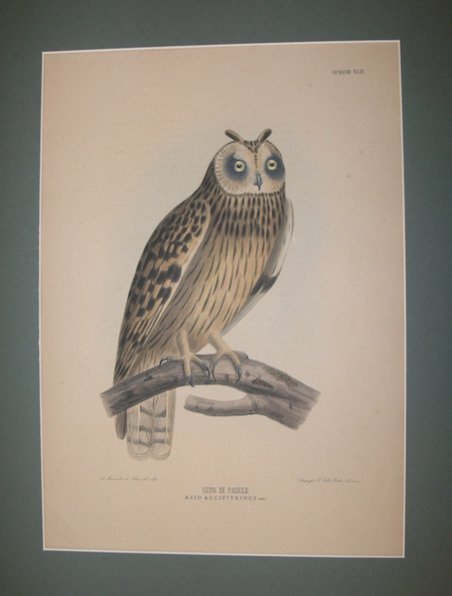 Litografia a colori, finemente acquarellata in epoca, tratta dalla rara ' Iconografia dell'avifauna italica, ovvero, Tavole illustranti le specie di uccelli che trovansi in Italia: con brevi descrizioni e note / testo del dott. Enrico Hillyer Giglioli; tavole di Alberto Manzella, ' edita a Prato prima e a Firenze poi tra il 1878 ed il 1882. ' Nel 1876 Enrico Hillyer Giglioli, professore di zoologia e anatomia comparata, pubblica, presso il Museo di storia Naturale di Firenze, ' la Collezione Centrale degli Animali Vertebrati Italiani, raccolta che ha fortemente influenzato la sua produzione scientifica. In particolare, la sezione ornitologica è stata oggetto di numerosi e importanti lavori che documentano l’immagine che gli studiosi avevano di queste specie alle soglie del Novecento.Giglioli inizia a lavorare sull’Iconografia della Avifauna Italica ' nel 1879, un ambizioso ma incompiuto programma editoriale che si poneva come scopo la rappresentazione dal vero di tutte le specie di uccelli della fauna italiana. L’opera doveva essere pubblicata in circa ottanta fascicoli mensili di cui hanno visto la luce cinquantaquattro, ognuno corredato di cinque litografie, ricavate dalle tavole, disegnate e colorate a mano da Alberto Manzella. ' In ottimo stato di conservazione. Color lithograph, finish by hand, taken from the rare ' Iconografia dell'avifauna italica, ovvero, Tavole illustranti le specie di uccelli che trovansi in Italia: con brevi descrizioni e note / testo del dott. ' Enrico Hillyer Giglioli; tavole di Alberto Manzella, ' edited in Prato first and in Florence then between 1878 and 1882.In 1876 Enrico Hillyer Giglioli, professor of zoology and comparative anatomy, published, at the Museum of Natural History of Florence, ' la Collezione Centrale degli Animali Vertebrati Italiani ' (Central Collection of Italian Vertebrate Animals), a collection that strongly influenced his scientific production. In particular, the ornithological section has been the subject of numerous and important works, which document the image that scholars had of these species on the threshold of the twentieth century.Giglioli began work on the ' Iconography of the Italian birdlife ' in 1879, an ambitious but unfinished editorial program that had as its purpose the live representation of all species of birds of the Italian fauna. The work was to be published in about eighty monthly issues, of which fifty-four actually saw the light, and each issue was accompanied by five lithographs, obtained from the plates drawn, and colored by hand by Alberto Manzella.In excellent condition. Cfr.